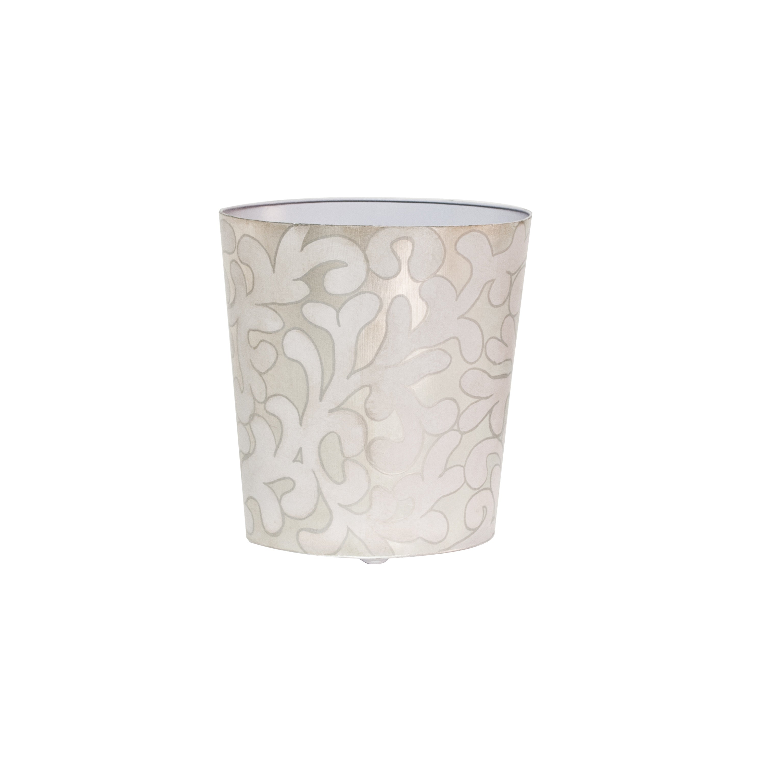 Unexpected details bring surprise and delight to your space and offer a professional finishing touch. This elegant oval wastebasket features a painted lavender floral pattern on a silver base with silver edge detailing.
