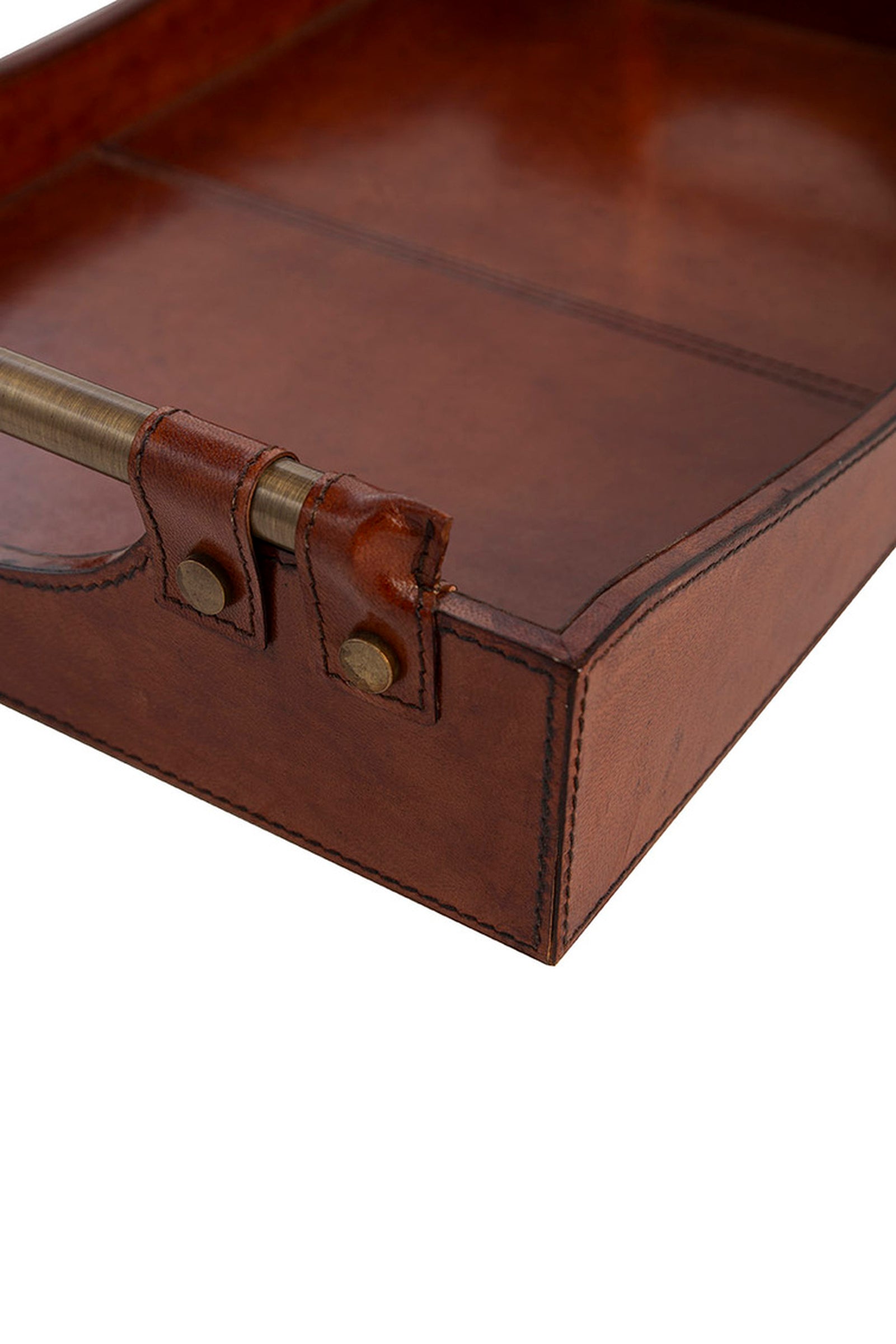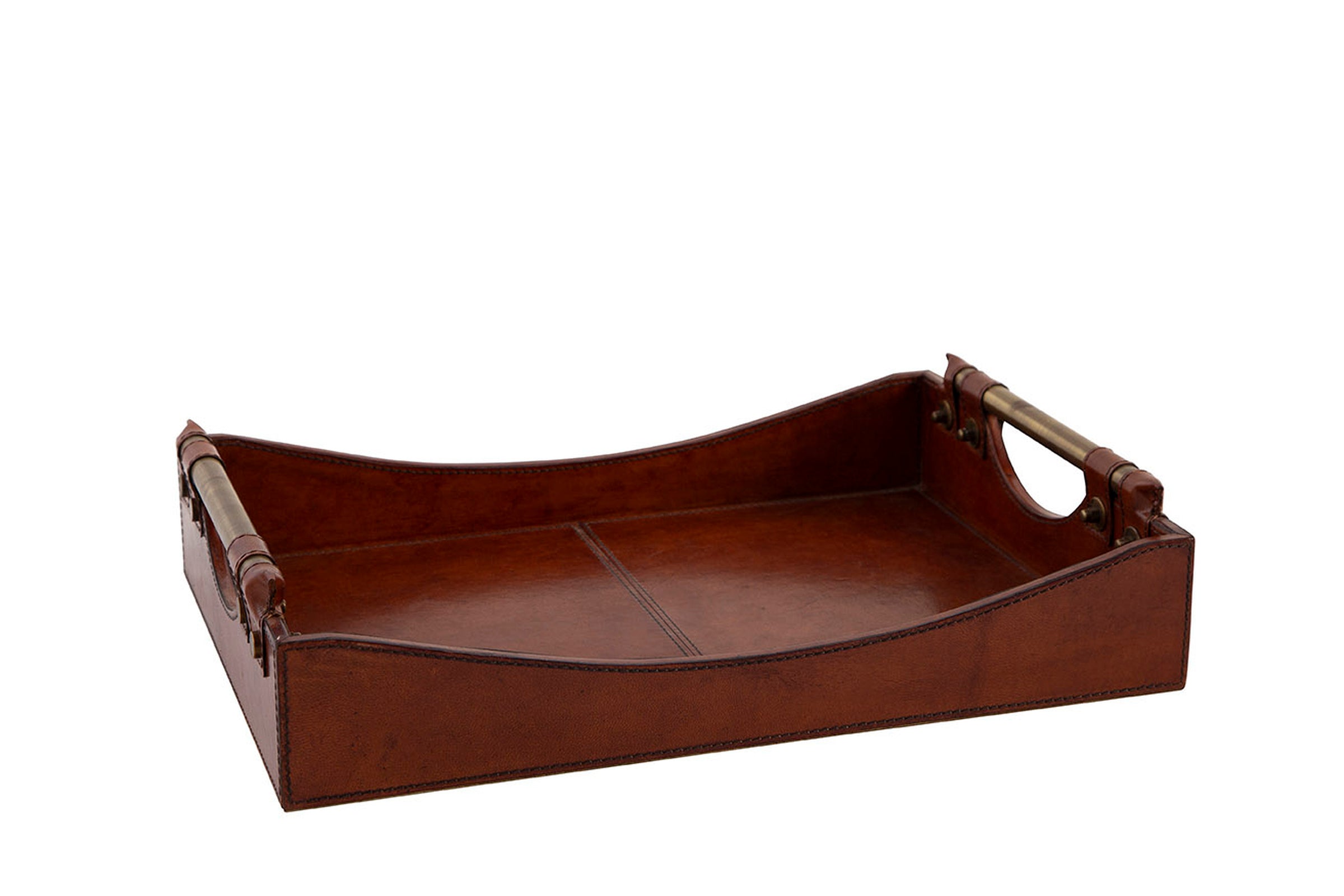 The Preakness Tray features a rich leather finish with elegant metal handle accents, adding a sophisticated touch to any setting.