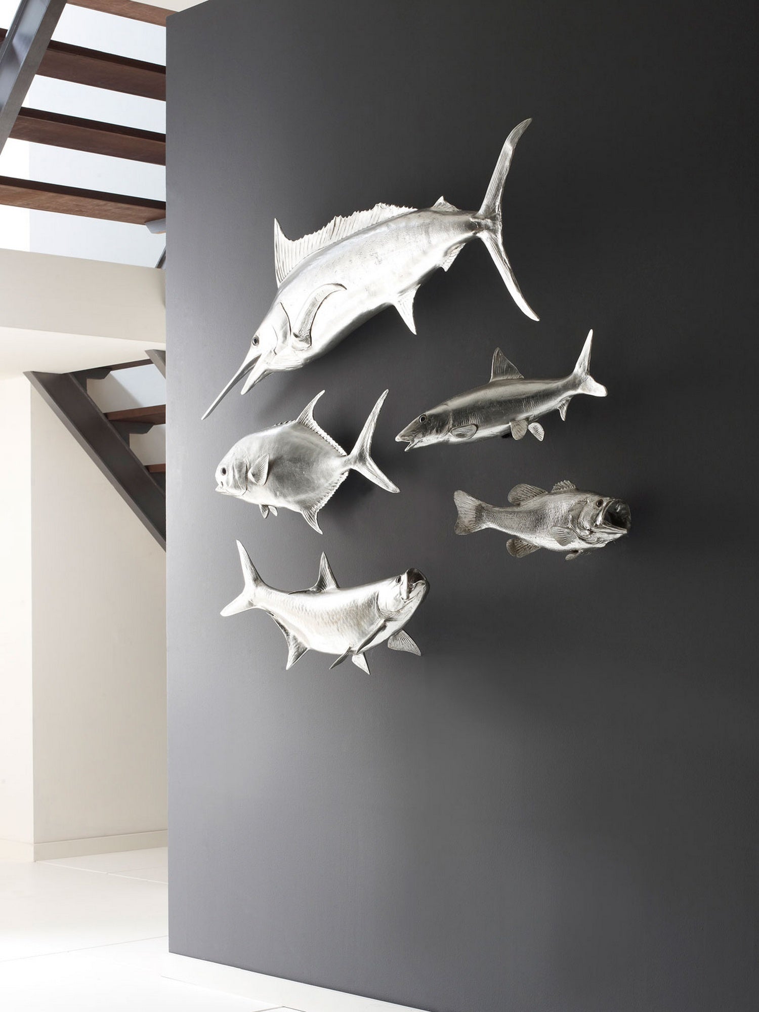 The Yellow Tailed King Fish Silver Wall Sculpture is made of composite in a silver leaf finish. This likeness of the seafaring creature is a chameleon of style—hang it in a modern kitchen and it takes on a zesty panache; place it in a child’s bedroom and it will become a playful element in the space. Whether you have a lakefront home, a beachfront condo, or an urban oasis, the Yellow Tailed King Fish Silver Wall Sculpture with its luminous finish will bring the watery world inside. Powerful on its own, group this sculpture in multiples to create a school of fish for added impact. We also offer this sculpture in a gray version. Both of these pieces of decorative wall art reflect the ethos that the Phillips Collection personifies: modern organic.