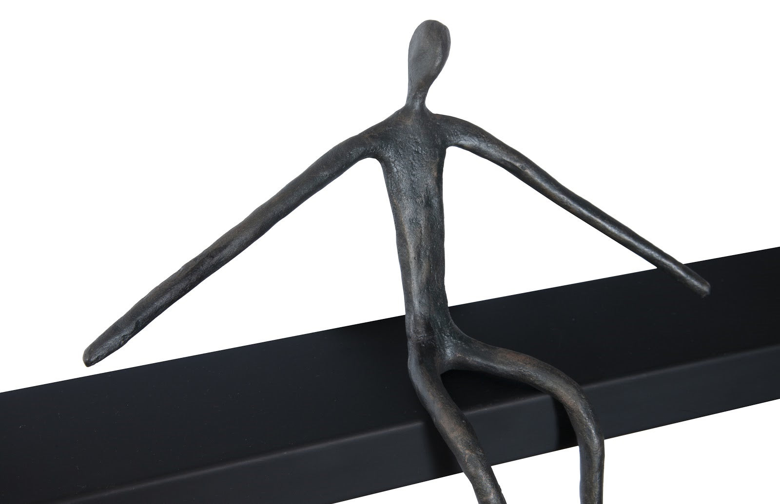 - Bronze-finished abstract figure complements black shelf for a striking visual appeal