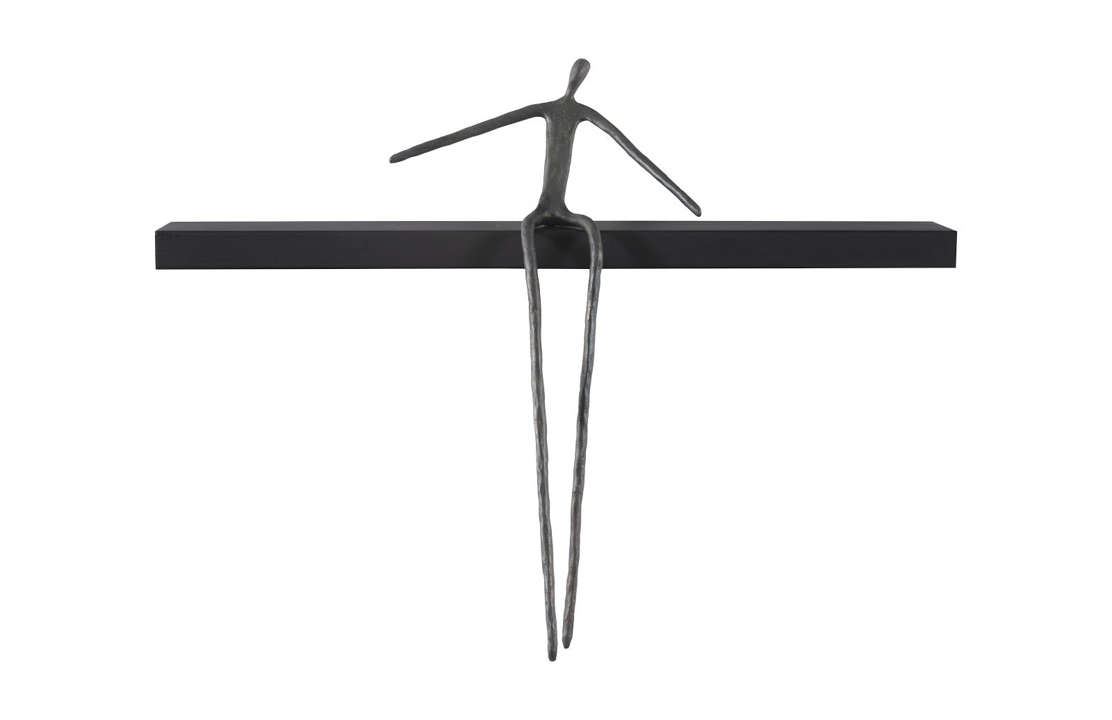 The clean lines of the slim decorative sculpture ornamenting the Long Moveable Leaning Man Shelf makes this a perfect accent piece for contemporary, modern farmhouse, and mid-century modern interiors. Abstractly rendered in metal in a bronze finish on a shelf in a black finish, the slim decorative accessory is whimsical on its own and will remain just as playful when other decorative elements are placed on the wood shelf. We also offer the long shelf with movable sitting, pointing, and standing men, which can be combined in an artful arrangement on an accent wall. These same figures also ornament shorter shelves in our decorative offerings. Each of these reflect the ethos that Phillips Collection personifies: modern organic.