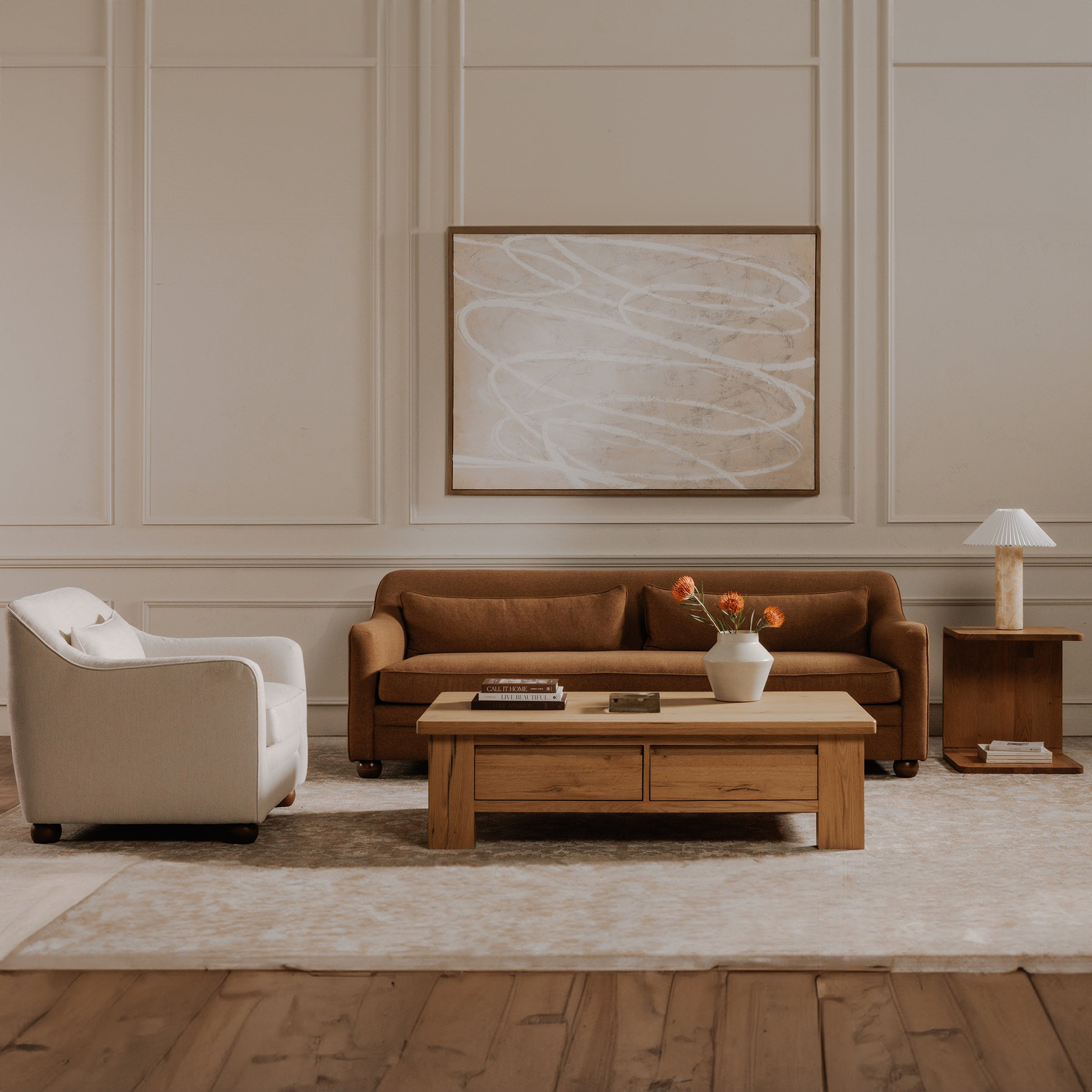 The Ever framed painting embraces the ruminative elegance of abstract minimalism. A curvilinear scribble paces across the canvas, creating a mesmerizing visual rhythm.