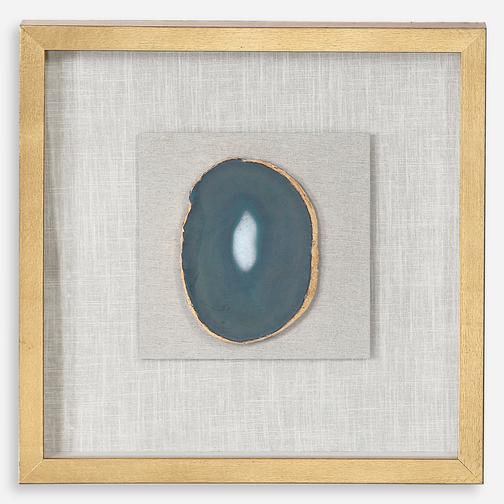 - A Pine Wood Shadow Box Featuring A Hand Applied Gold Leaf Finish Showcases A Striking Emerald Green Agate Stone With White Veining