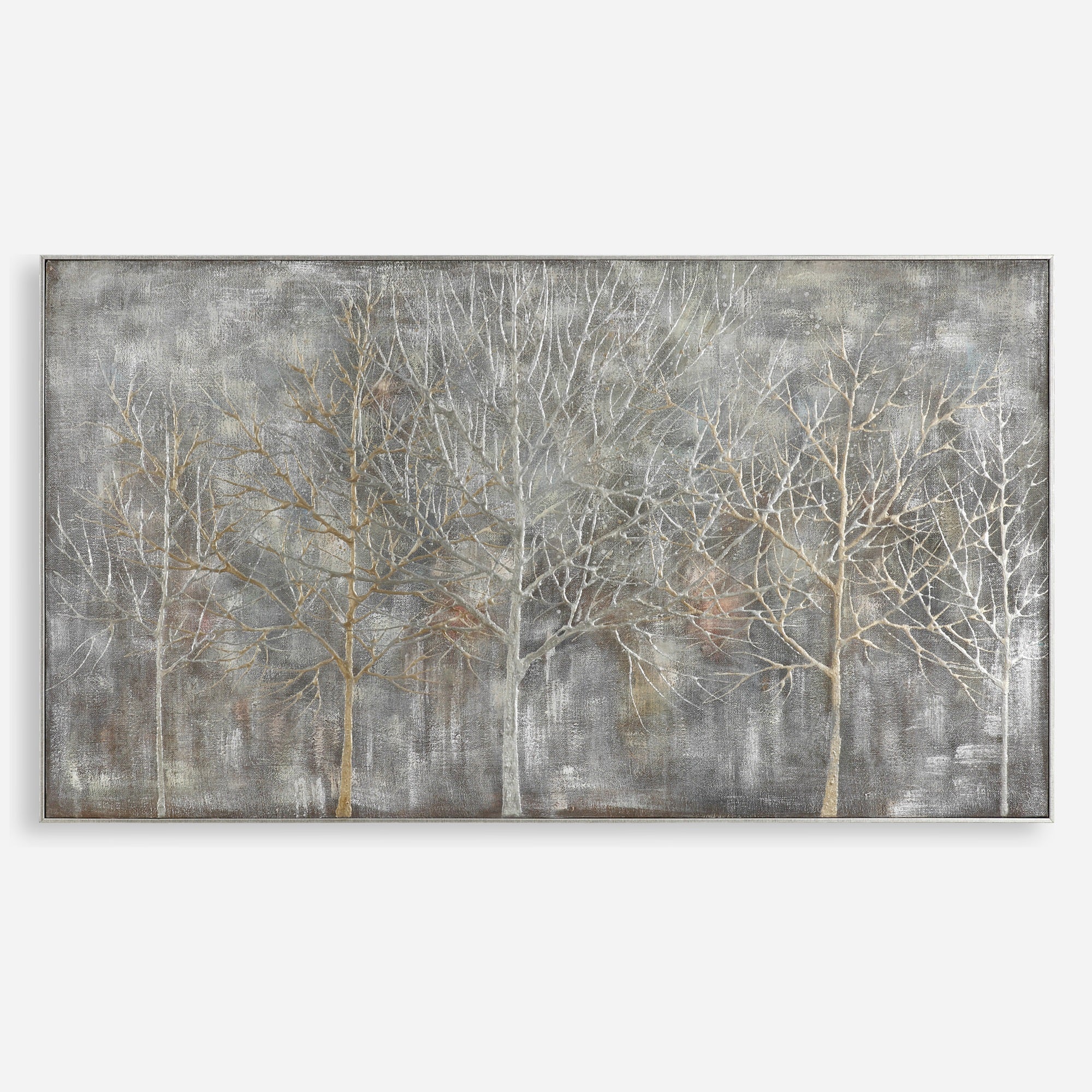 Contemporary In Design, This Hand Painted Landscape On Canvas Features Heavily Textured Accents, Which Create A Raised, Dimensional Effect. Gray, Gold, And Silver Hues Form A Versatile, Neutral Color Palette. Each Canvas Is Stretched And Attached To Wooden Stretchers And Surrounded By A Petite, Champagne Silver Leaf Gallery Frame. Due To The Handcrafted Nature Of This Artwork, Each Piece May Have Subtle Differences.