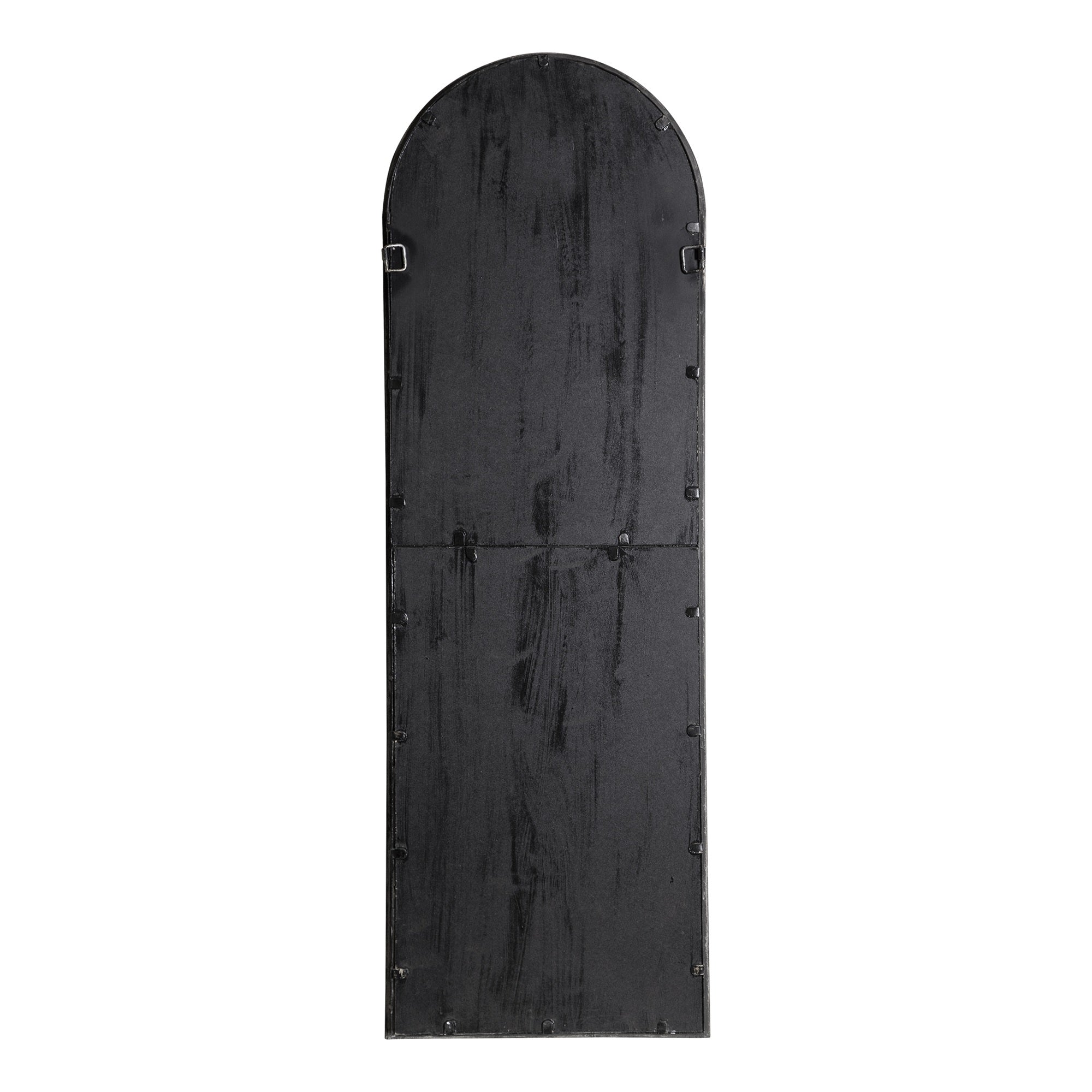 this arch features a forged iron frame in a hand applied warm bronze finish with burnished distressing encasing an antique style mirror.