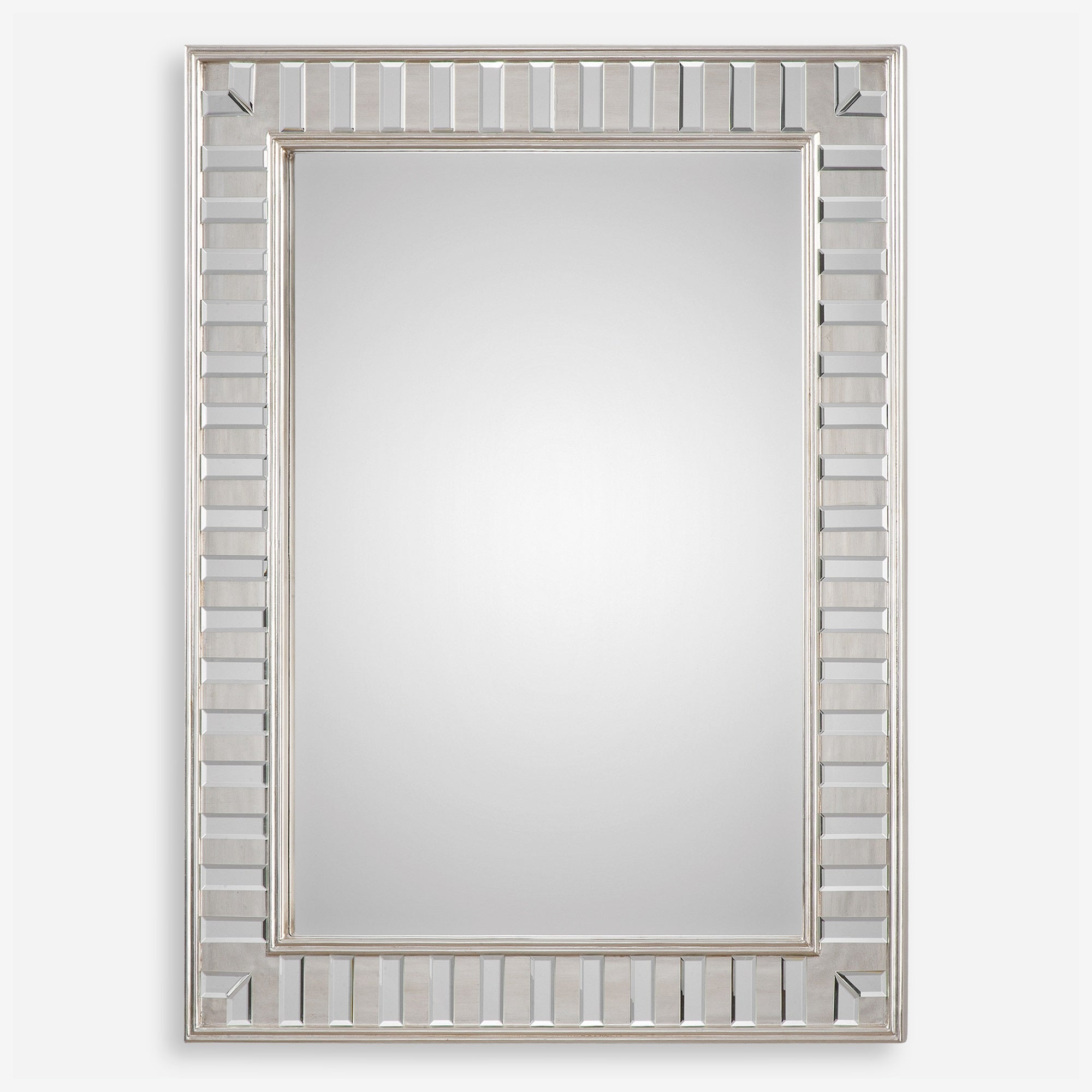 Sleek And Elegant Finishing Touch For Any Room. The Solid Pine Frame Features A Lightly Antiqued Silver Leaf Finish Decorated With Small Beveled Mirrors. Hangs Horizontally And Vertically.