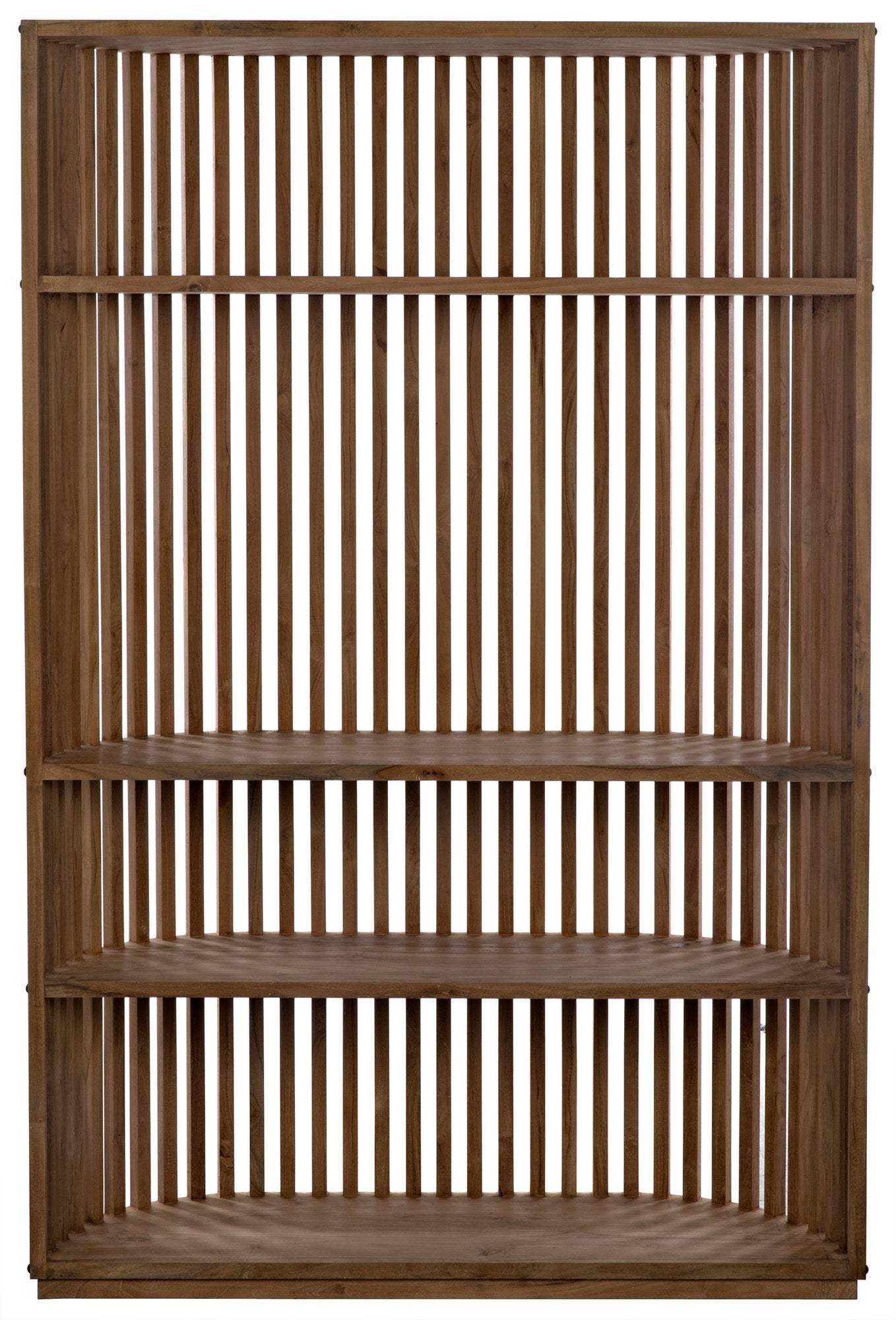 A gently curved shape is complemented by perfectly straight lines in this hand-carved shelving unit. Fully finished, from the back you'll appreciate nailhead inspired accents, and from the front dramatic vertical lines demand attention. Handcrafted of teak.