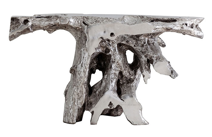 When we spot a shape that blows us away, the designers at Phillips Collection are not shy about bringing a bit of bling to elemental symbols we see in the woods. Case in point is our Brivo Freeform Silver Console Table, which is made of composite in a luminous silver leaf finish. Cast from one of our favorite Origins pieces of wood, this tree-trunk console table personifies our ethos of modern organic. By treating the surface of this log console table to such a brilliant finish, we’ve created a chic piece for contemporary interiors. Just imagine how perfectly it will fit into the décor of a modern apartment or a sleek coastal condo! We also offer the table in a liquid silver finish that is equally stunning.