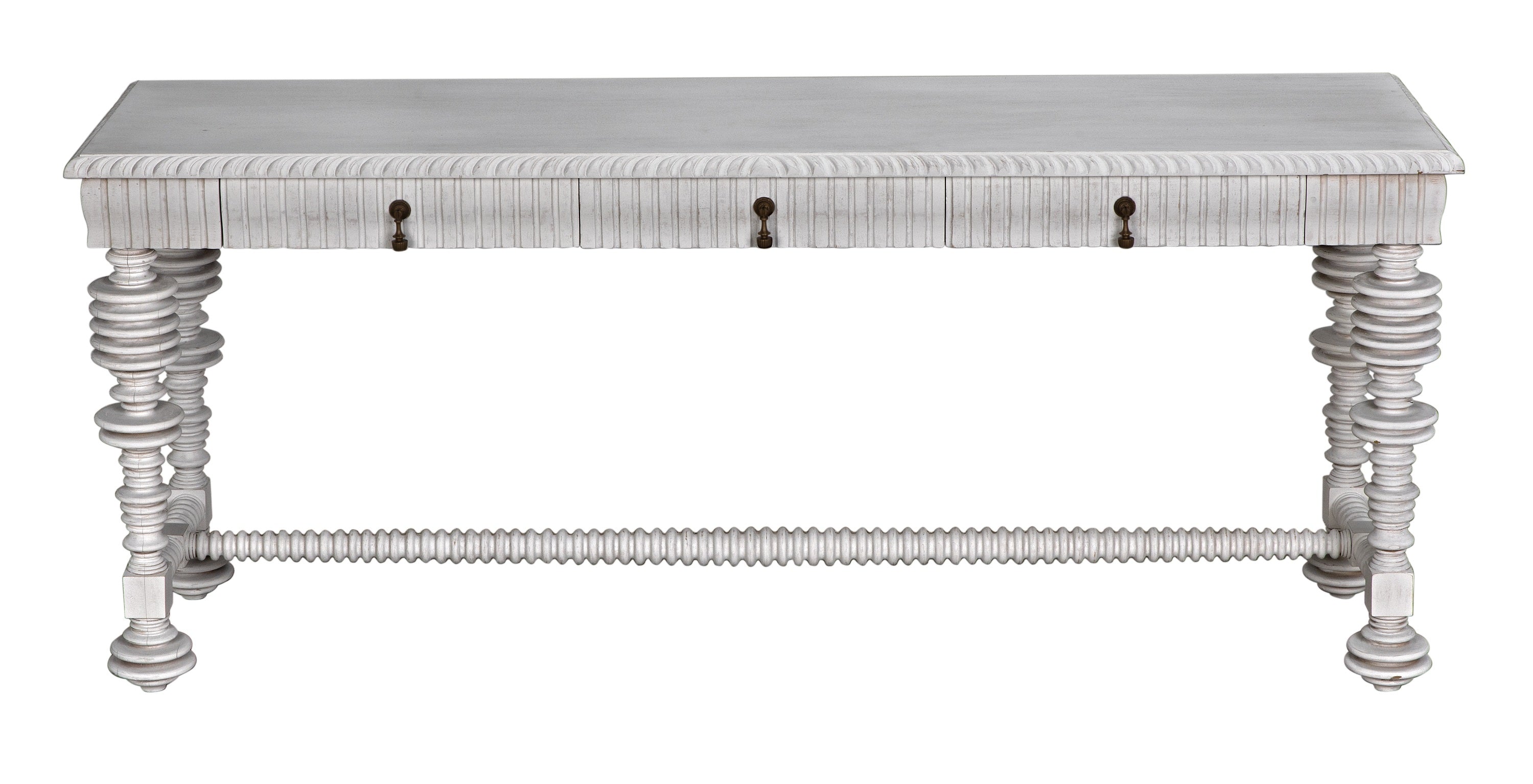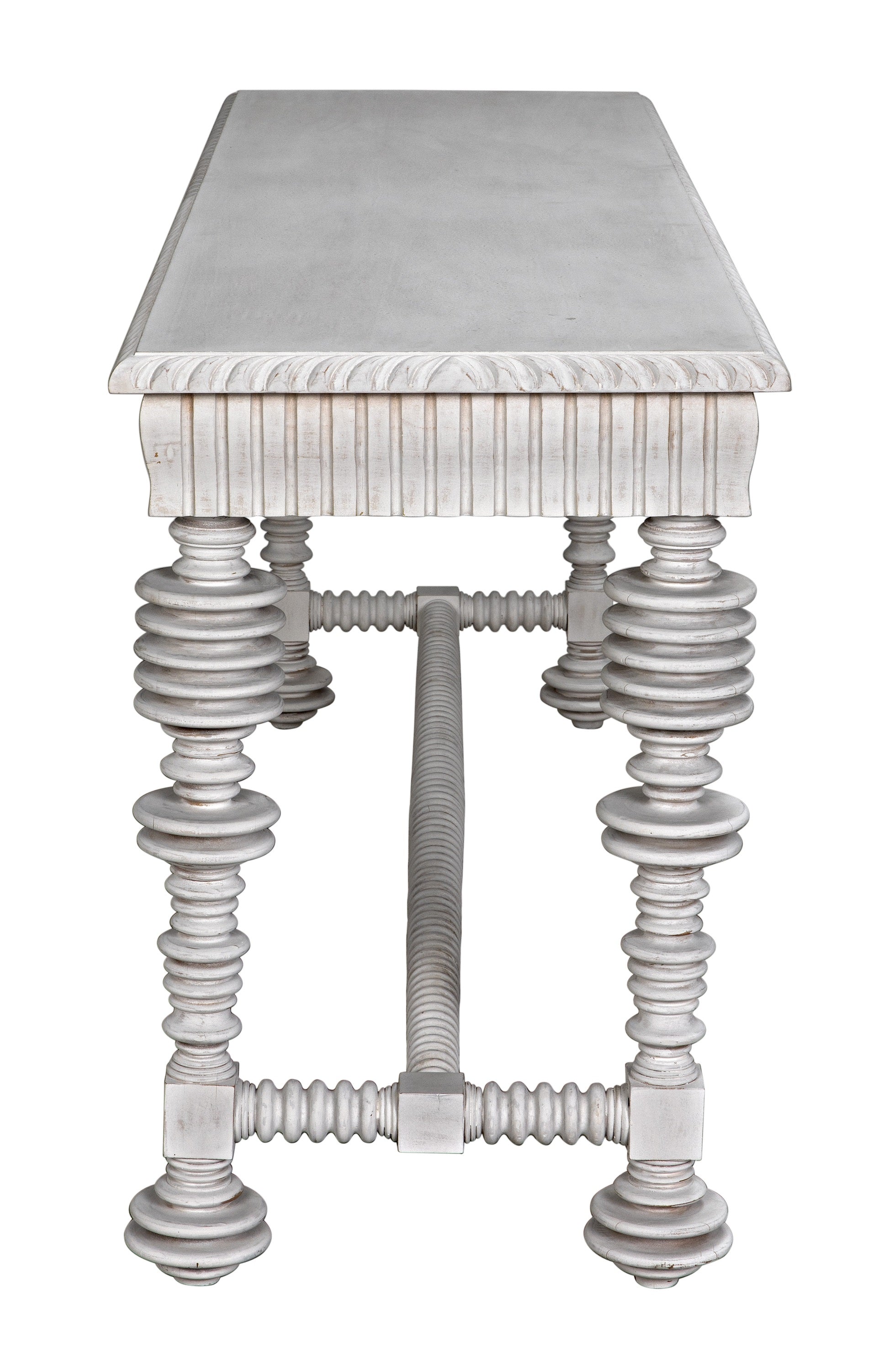Introducing the stunning Portuguese Console in White Wash, a masterpiece crafted to perfection by Noir Trading, Inc. This console effortlessly combines classic design with a touch of rustic charm, making it a standout addition to any living space.