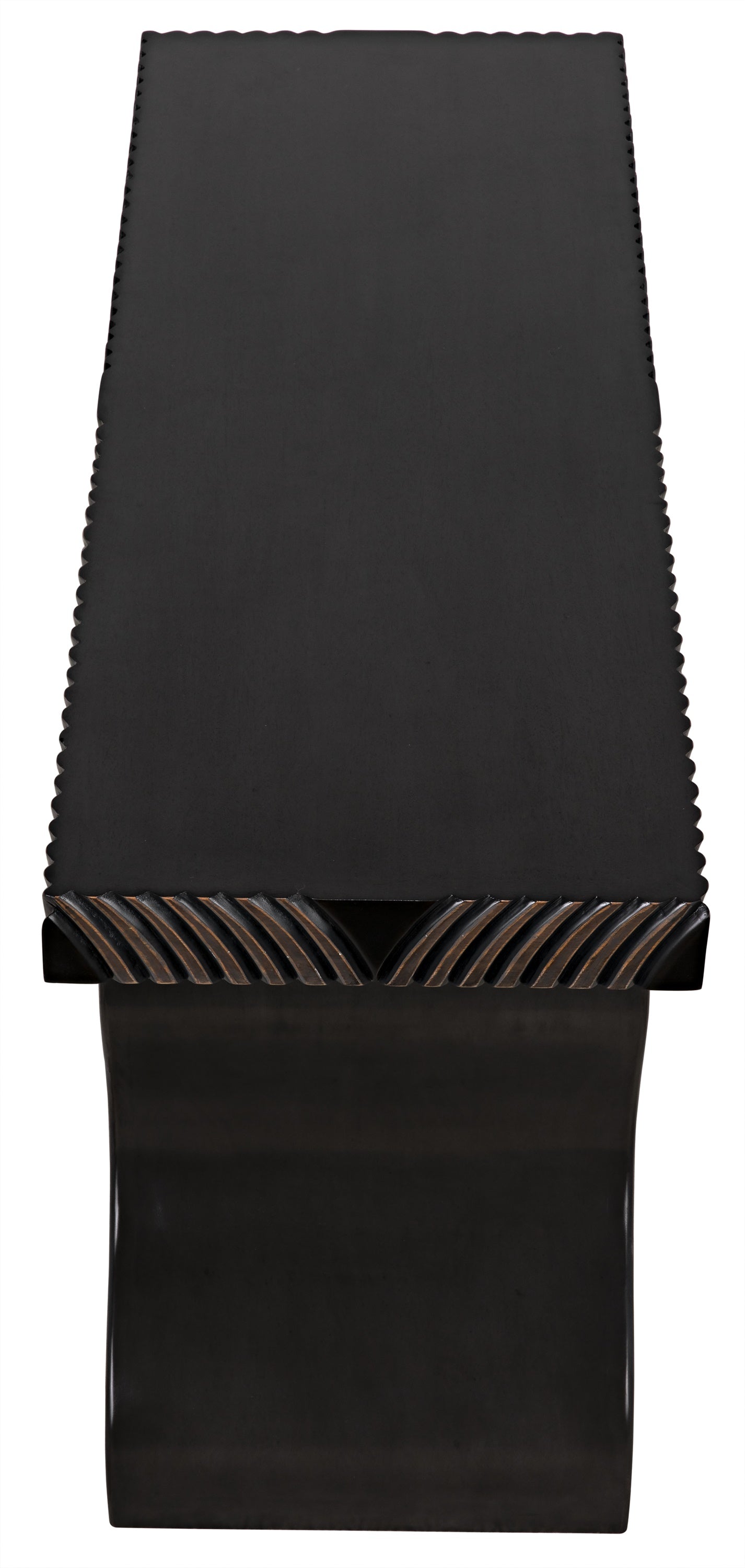 Undulating carvings that recollect open hands and old growth forests cover the waved base, as well as the edges of the rectangular top, of this unique console. Crafted of mahogany, the wood is finished with Noir's rich Pale finish and given light brown highlights that accentuate its sweeping lines.