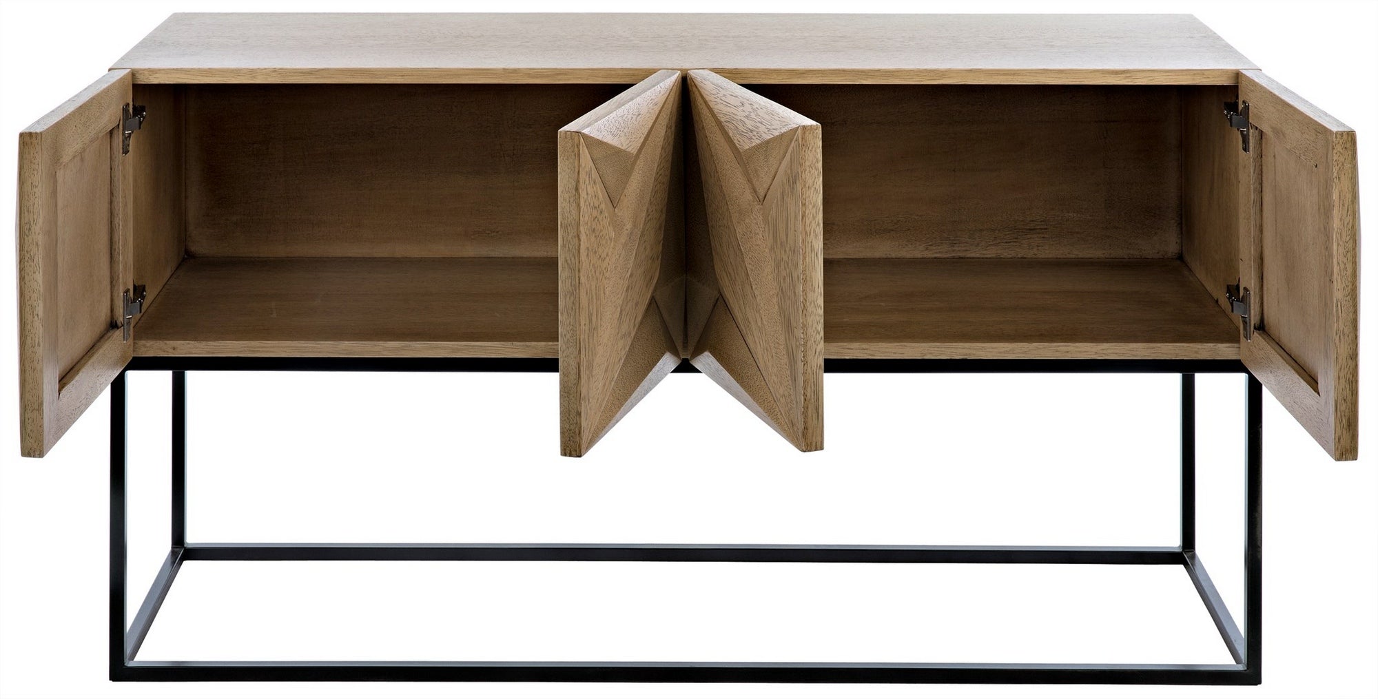 Stunning in its simplicity, this solid walnut sideboard rests atop slim metal legs. Each of its four doors is beautifully hand-carved with bold diamond and rhombus patterns. Open, they reveal generous interior storage. Simplicity, perfectly rendered.