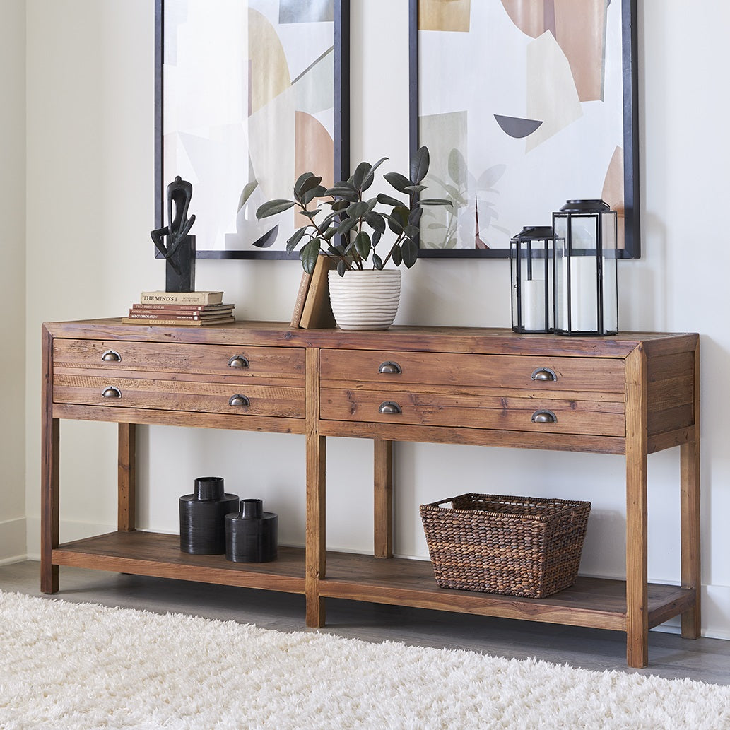 Taking cues from one of our best selling pieces, this Apothecary sideboard features a warm brown finish on solid pine, which blends beautifully with other wood tones. The stately length is emphasized by the presence of a practical bottom shelf, and features two side hung drawers which offer ample storage within. The polished bronze cup pulls on the drawers add a touch of brightness to the warm finish. Whether gracing your entry with family shoes on the shelf, or as a base for your biggest big screen with favorite games stashed below, this majestic piece is sure to please.