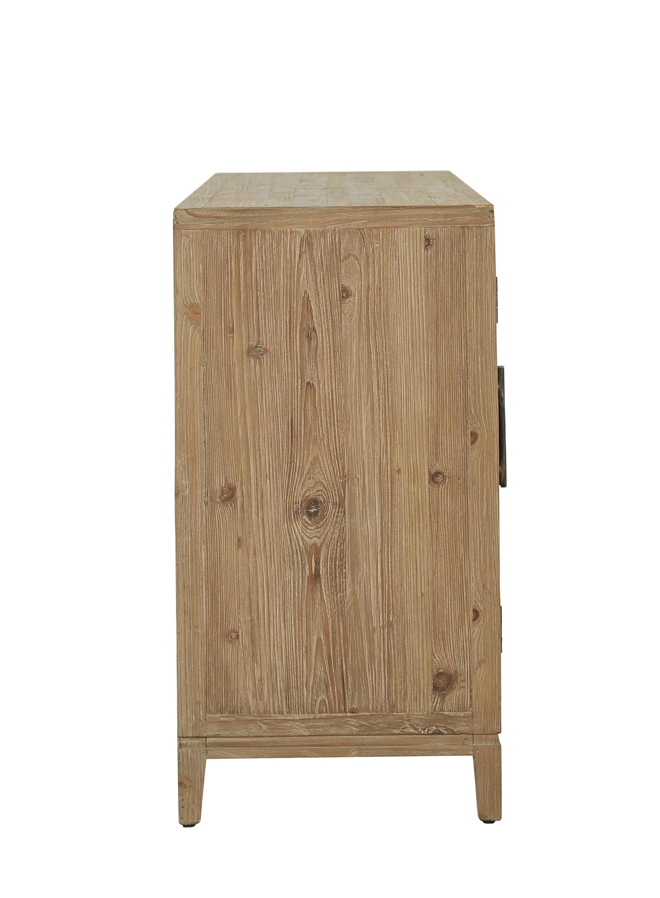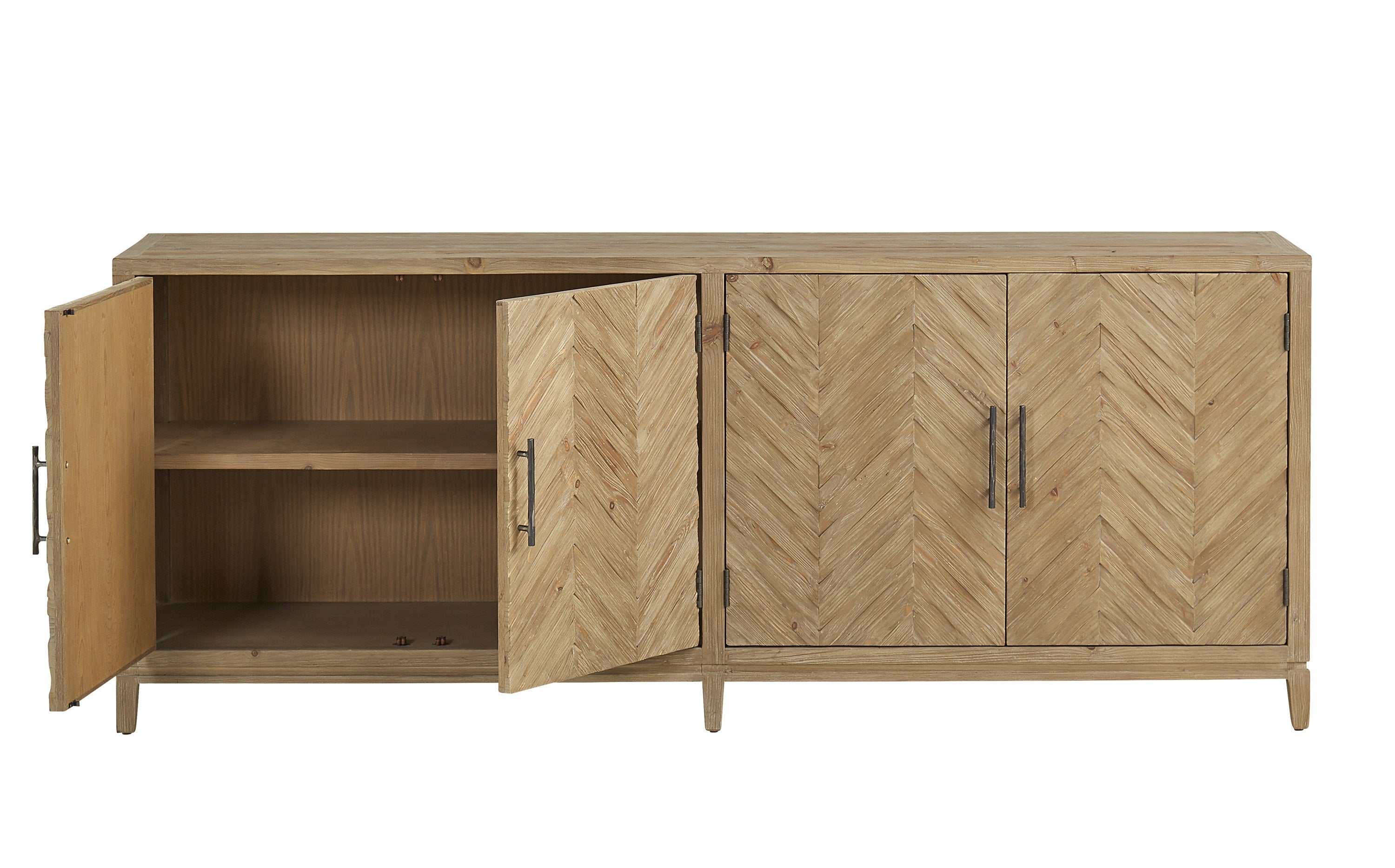 Truly breathtaking, this amazing sideboard appears to be crafted of woven strands of reclaimed pine. The geometric nature of the chevron design is softened by the varying natural wood tones and by the shadows cast by the undulating surface. There is no mistaking the hand crafted aspect of this beauty. Even the pulls are hammered to create visual interest. Not just a pretty piece, there is plenty of storage offered within, and a shelf keeps it all organized.