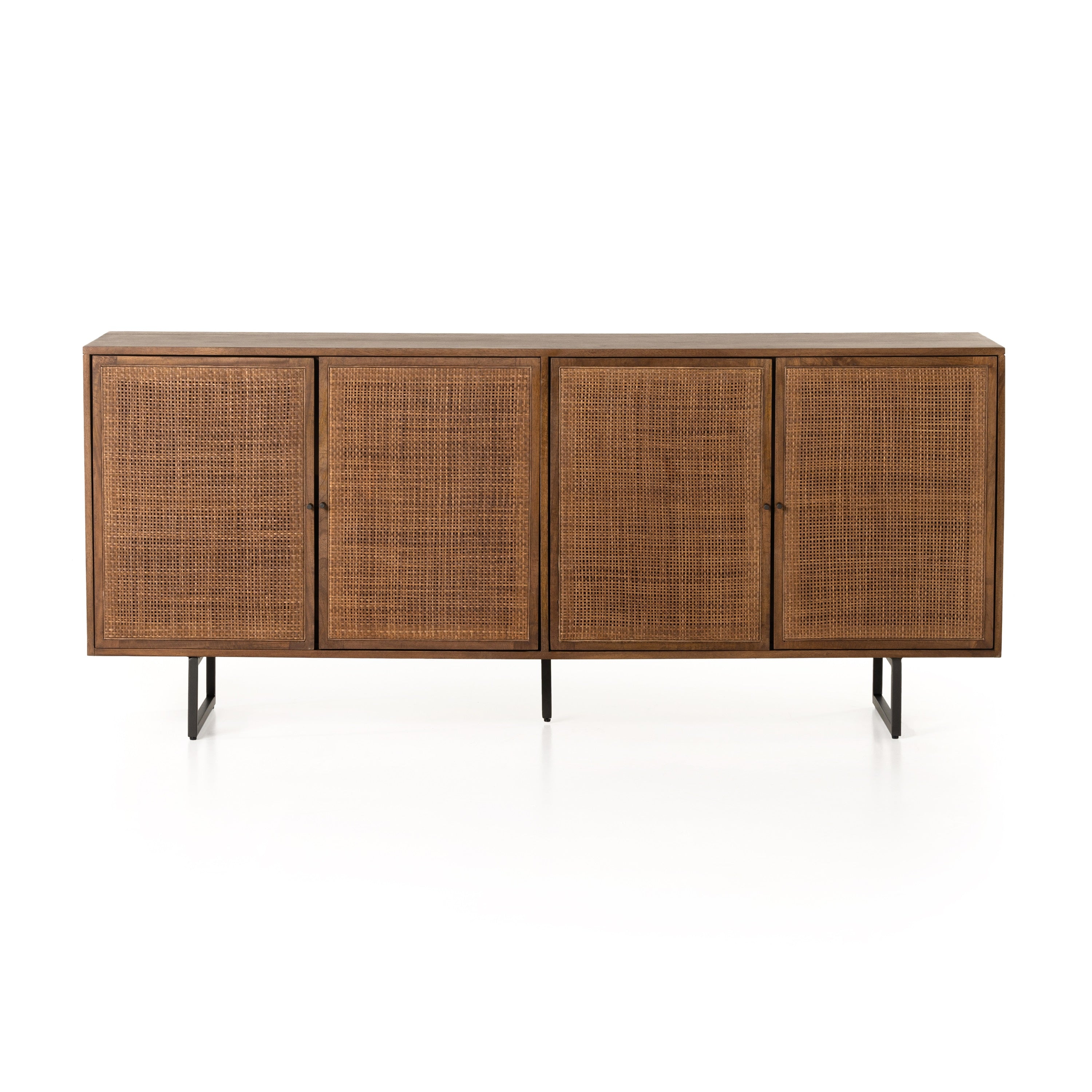 Midcentury-inspired style with an organic twist. Surrounded by brown-washed solid mango casing, cane door fronts weave for a look of great depth. Angular iron legs offer an intriguing contrast of texture and tone.