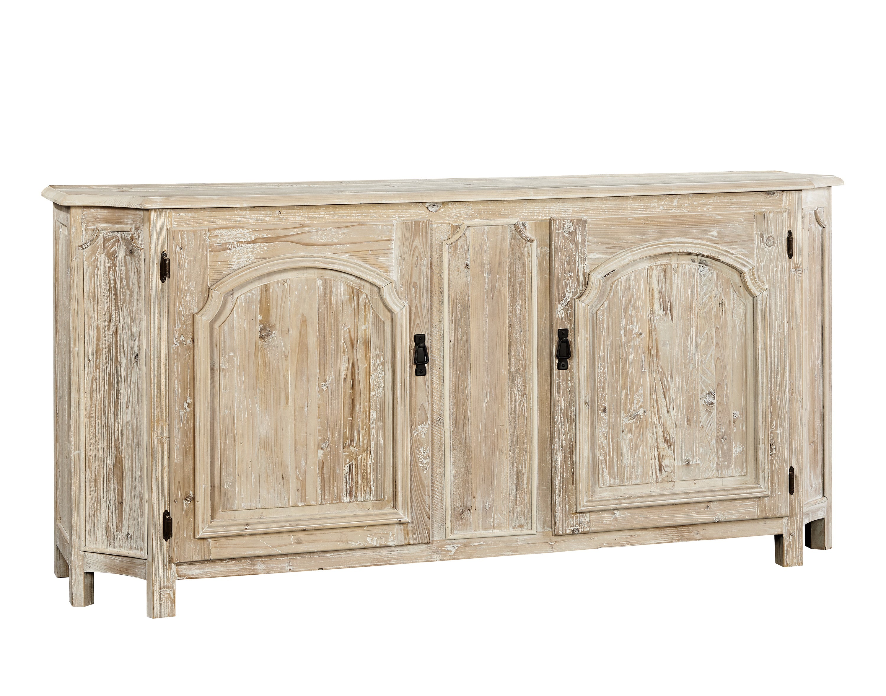 Quietly elegant with concave curved ends and gently arched applied panels on each door, this reclaimed pine sideboard offers substantial storage with a shelf behind each door. Perfect beneath a piece of art, it also welcomes a big screen TV making this cabinet a great fit in many rooms.