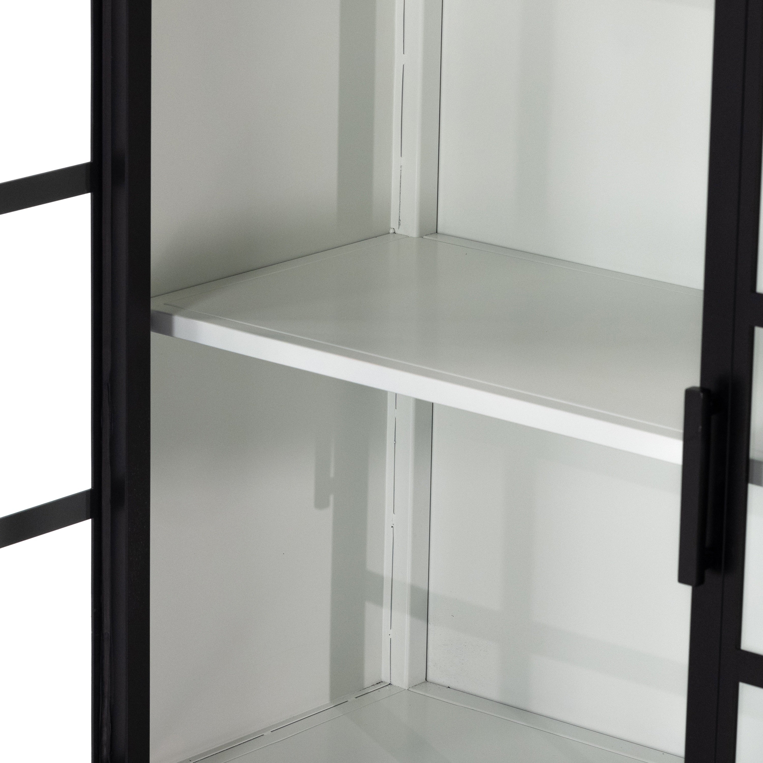 Finished in a classic black, an iron sideboard takes on tempered glass door fronts with traditional window-style paneling, for a clean look with great contrast. See-through front allows for endless styling and display options, with rear cutouts providing easy cord management.