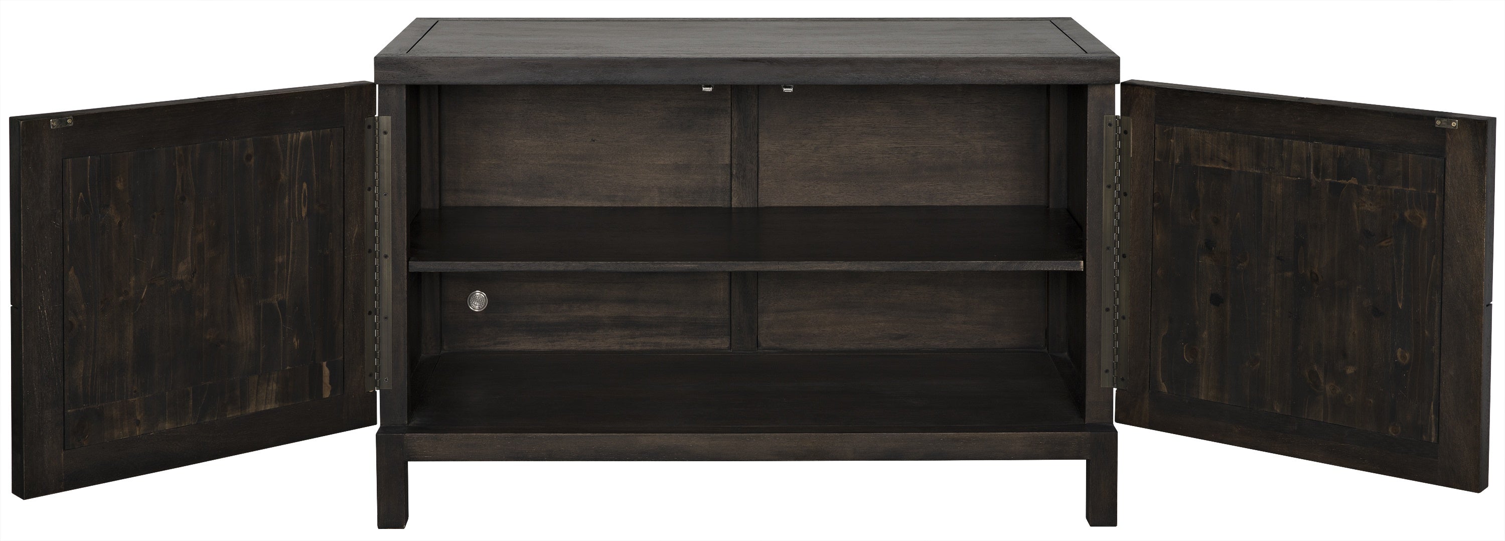 Two geometrically carved doors open via hidden push latch to reveal one large interior cupboard, with one removable shelf, in this handcrafted and finished walnut sideboard. A strikingly beautiful piece, its sophisticated design is an easy addition to any room.
