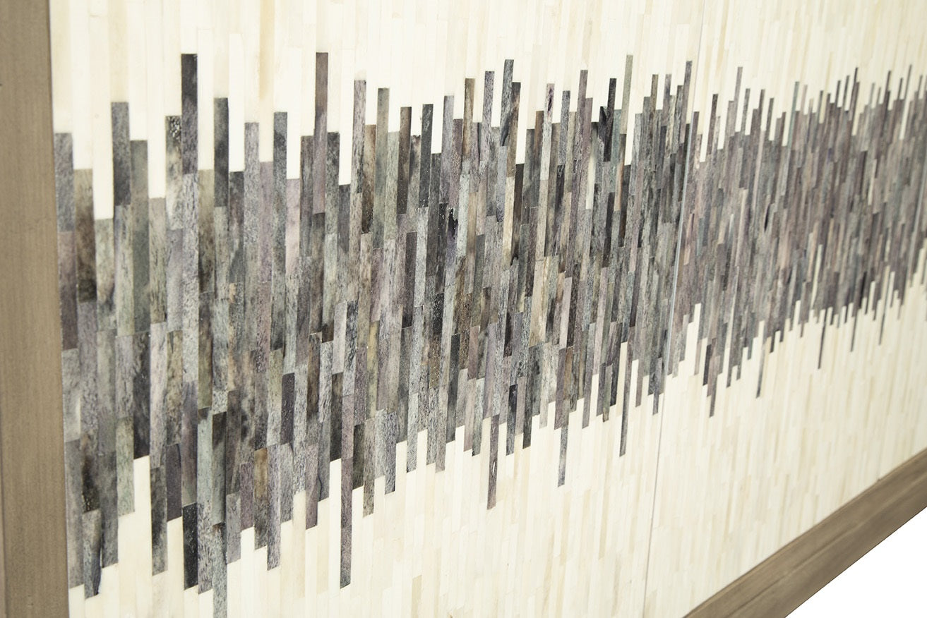 Exquisite inlaid design of bone and shell lifts this acacia piece to a higher level. Colors of cream, blues and grays nuetrally fit so many designs. Add the easy touch-open doors and this sideboard completes that elevated look.