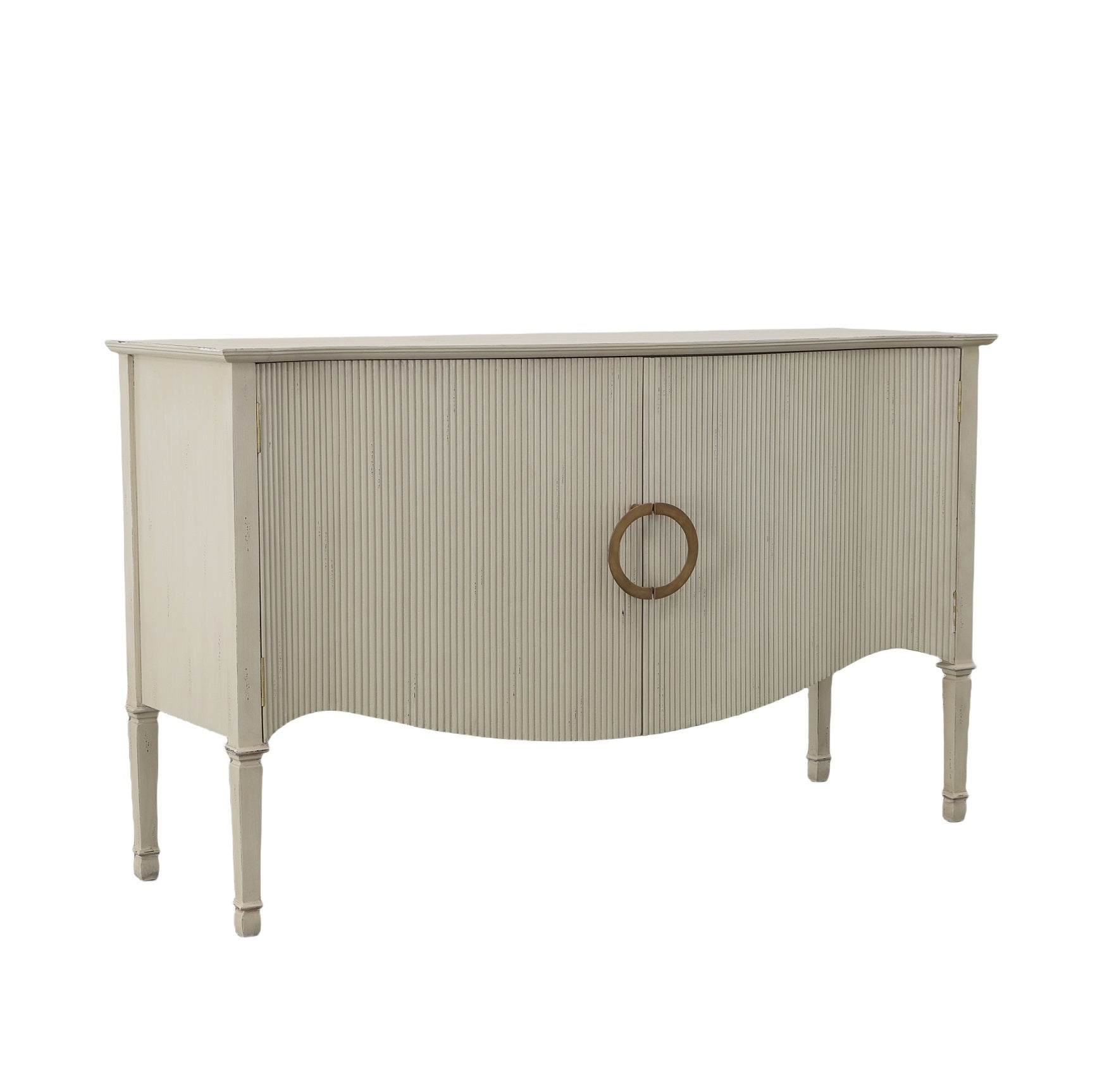 Subtly curved to add even more visual charm, this commodious sideboard features a practical adjustable shelf behind its uniquely routed doors. The solid mahogany frame is enlivened by the application of a lightly distressed cream finish. The quiet beauty of this sideboard is emphasized by the distinctive brass pulls.