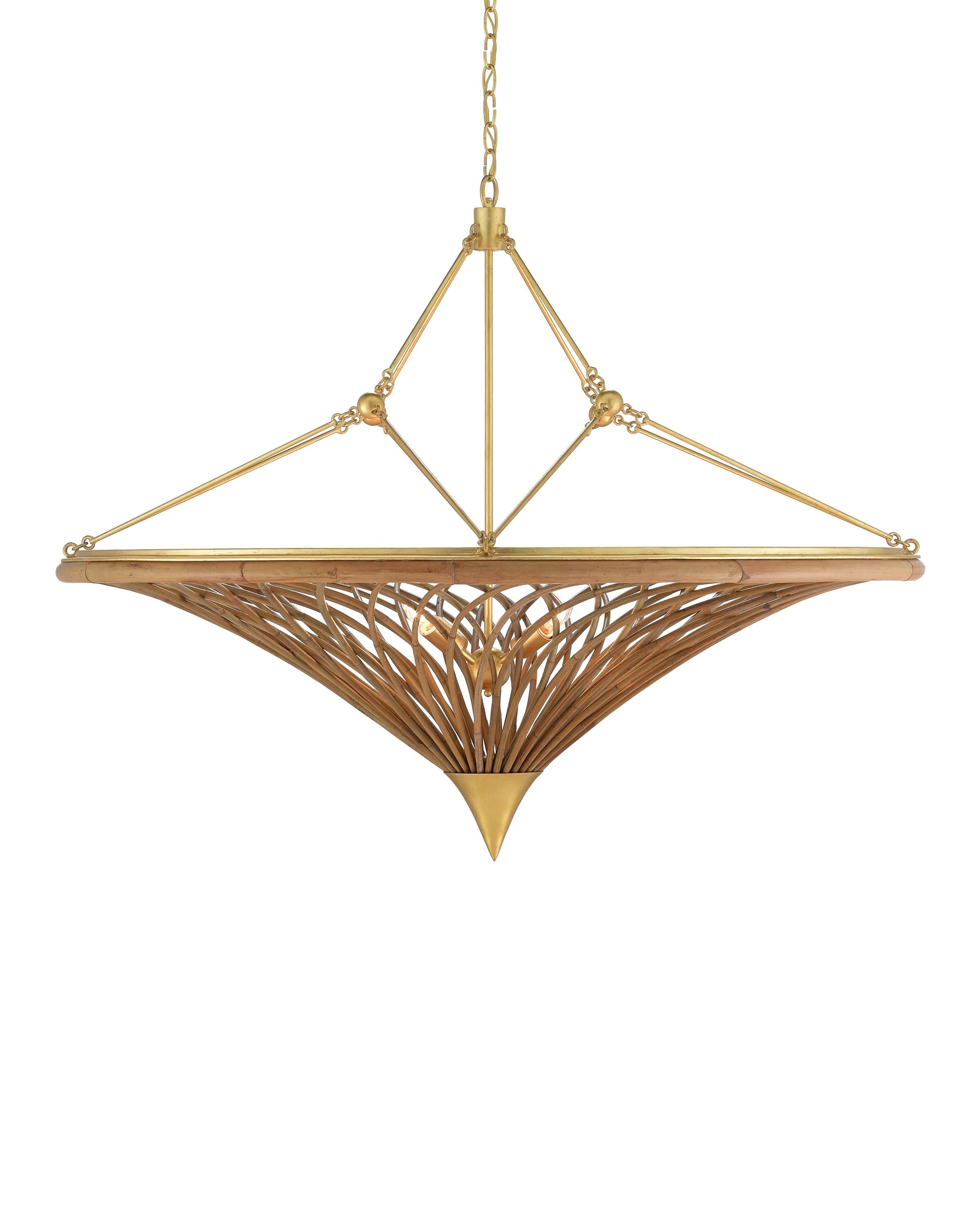 Working with natural materials like rattan is a strong suit of our artisans, who’ve taken the reeds and woven them into a work of art in our Gaborone Chandelier. The frame is made of wrought iron in a contemporary gold leaf finish. The hanging hardware on this natural rattan chandelier and the pointed cap at its bottom-most point add to the warmth of this lovely fixture.
