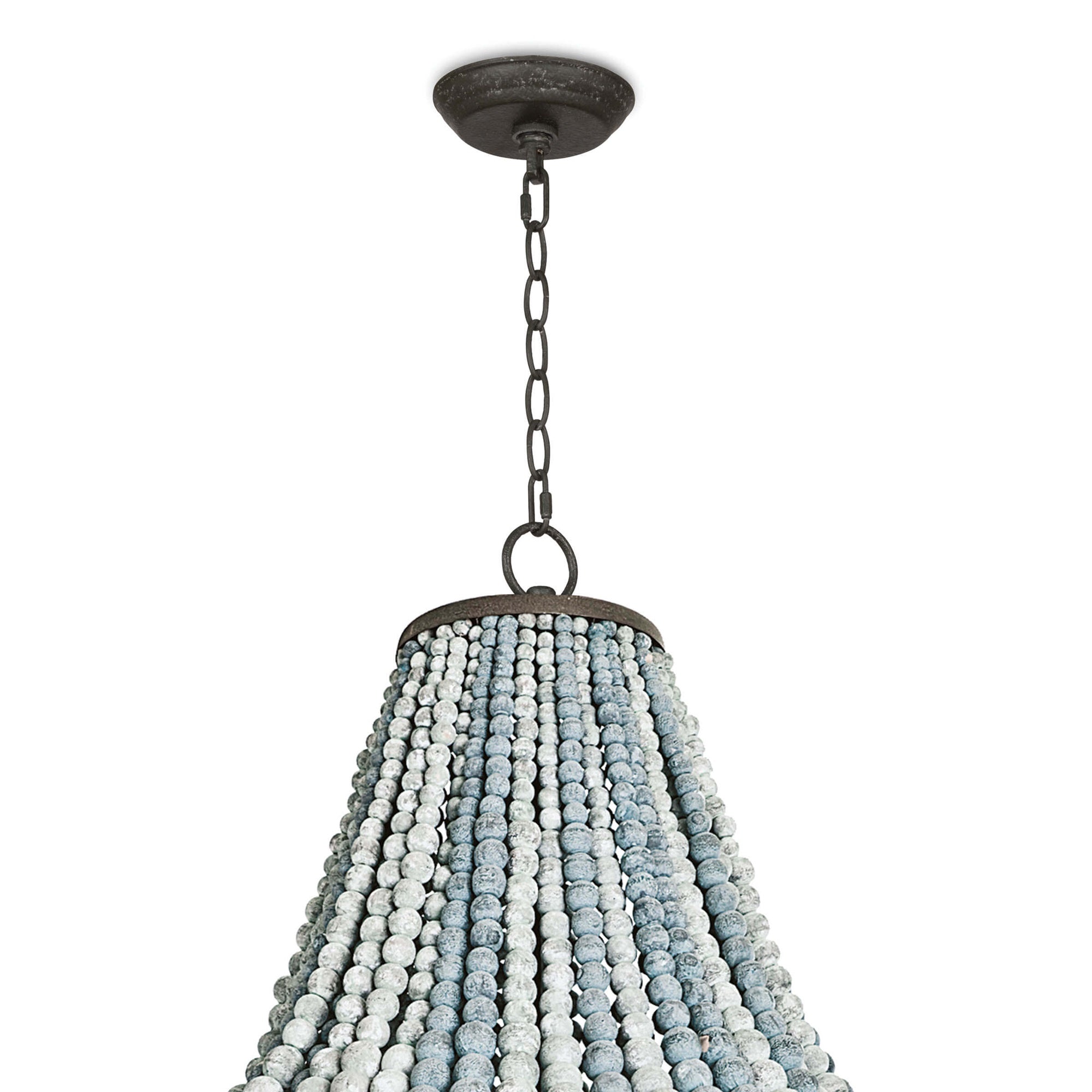 Classic style meets modern charm with this chandelier. A bevy of draped weathered blue wooden beads, dresses up the steel structure, bringing out an earthy glamour to any space.