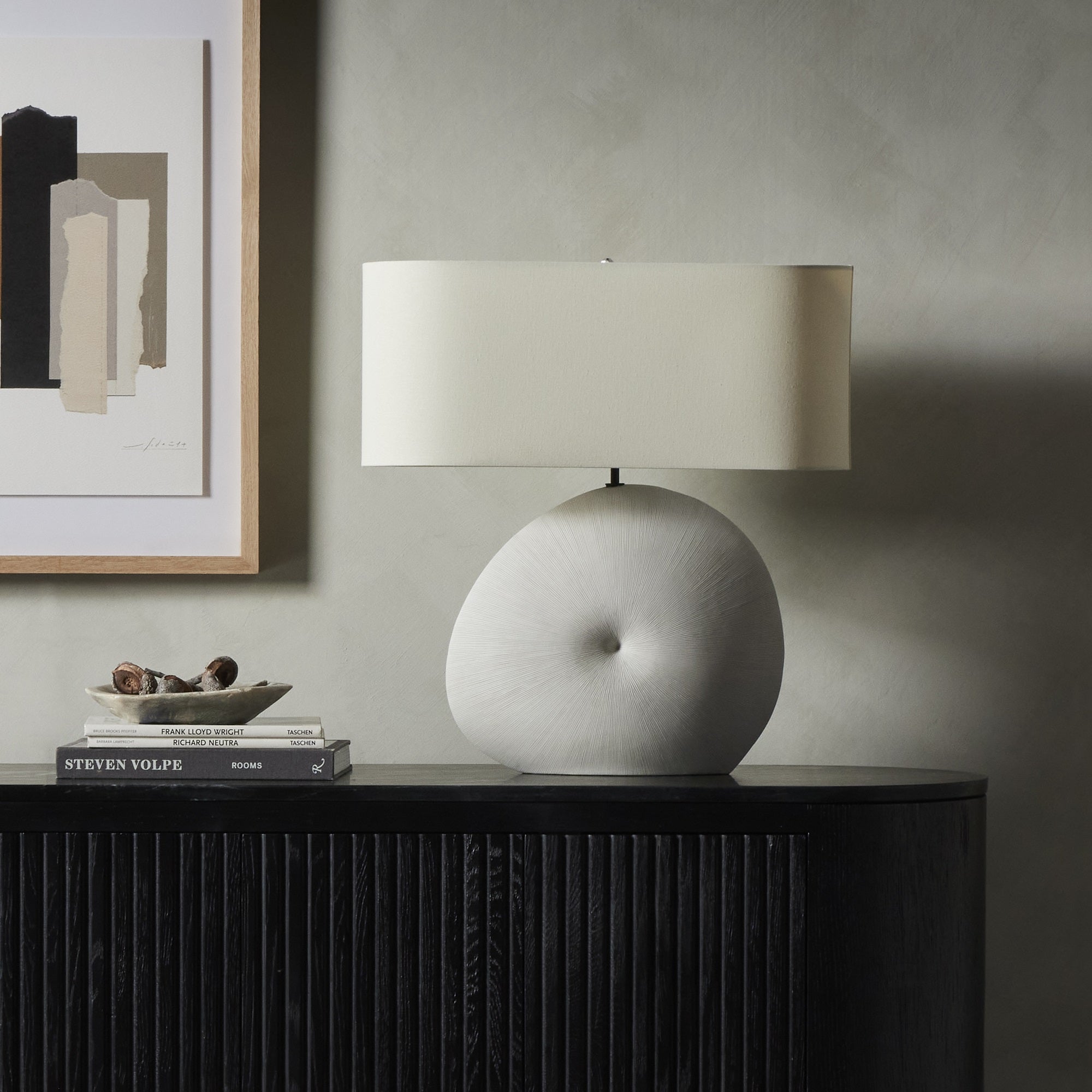 Bringing to mind found treasures washed ashore, the organic shape of this white ceramic lamp base is topped with a linen shade for textural contrast and a casual vibe.