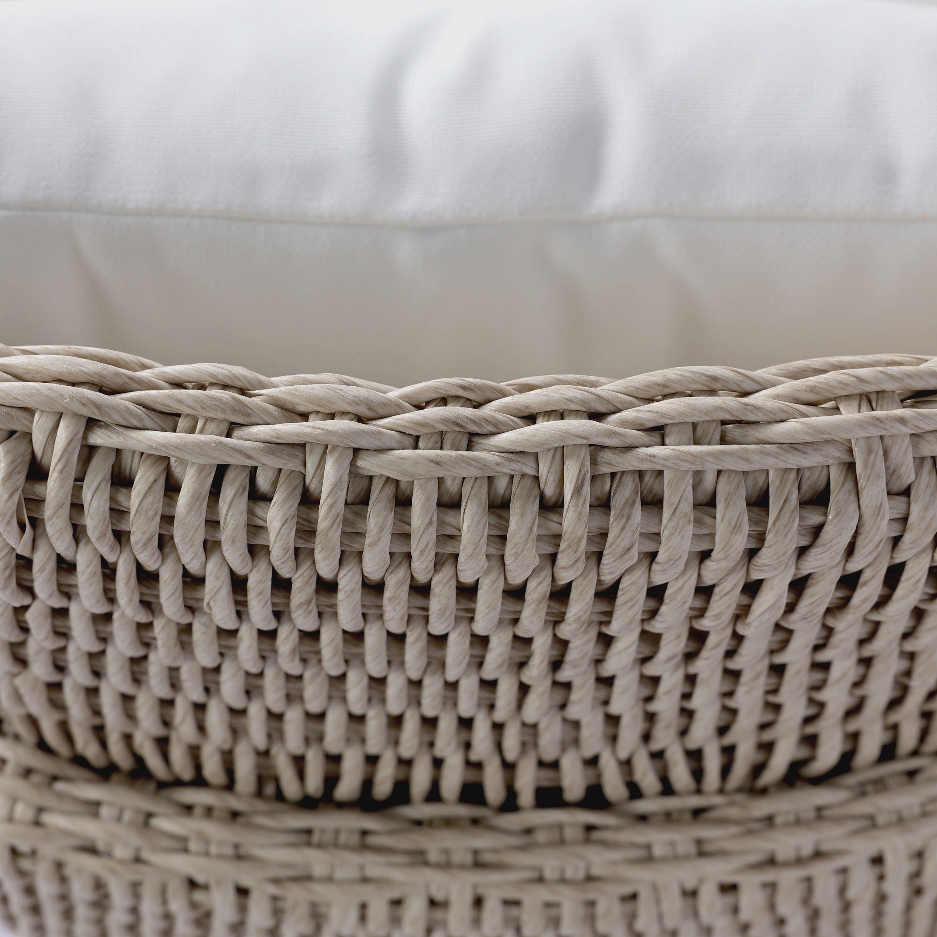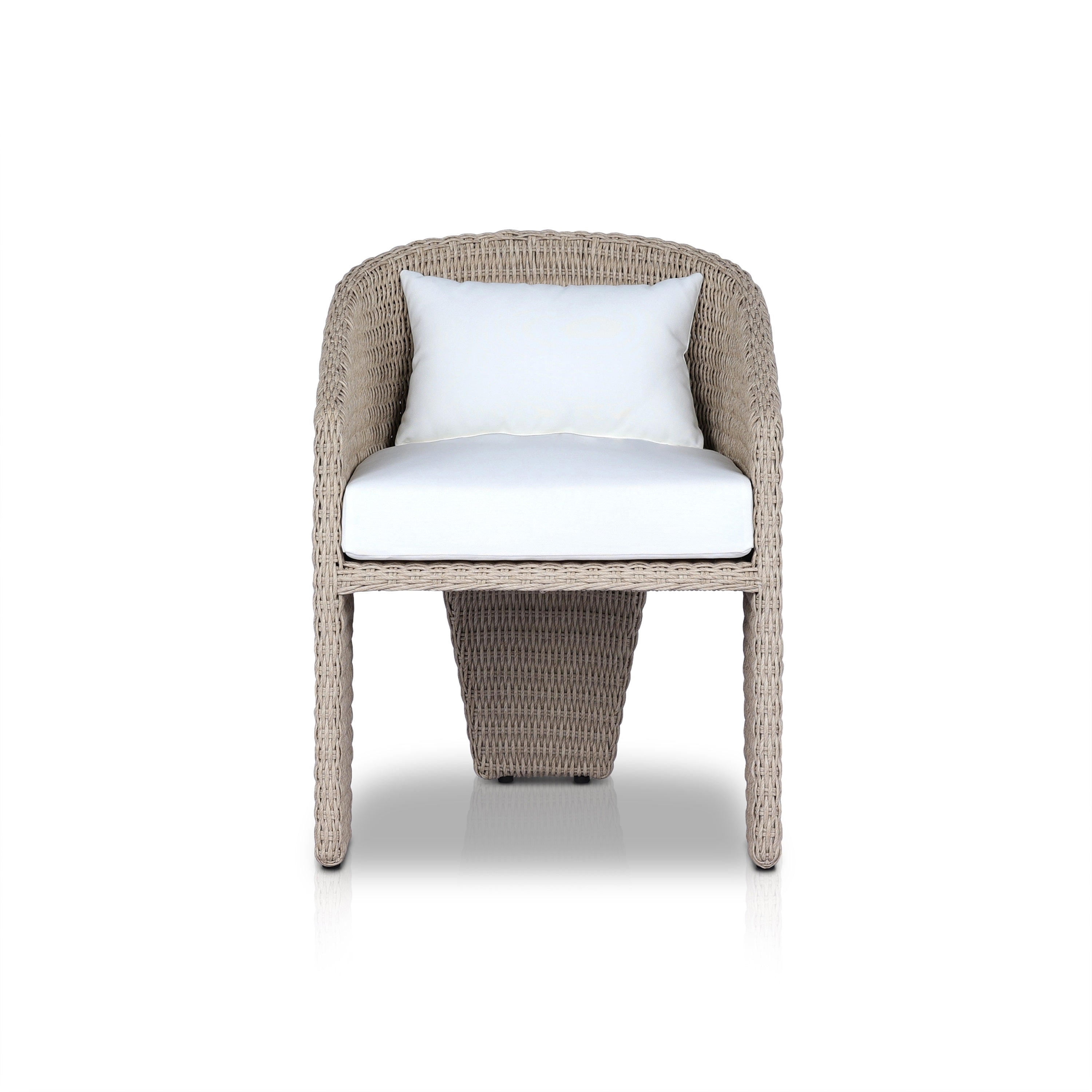 A unique three-leg outdoor dining chair based on the popular indoor silhouette. All-weather wicker framing forms a barrel-shaped back and kick back detail on the leg, accented by a box seat cushion with knife edge back cushion. Covered in 100% olefin, known for its UV-resistant, water-repellent and quick-drying abilities. Cover or store indoors during inclement weather and when not in use. Our Weatherproof Outdoor Dining Chair Cover in size large fits this chair.