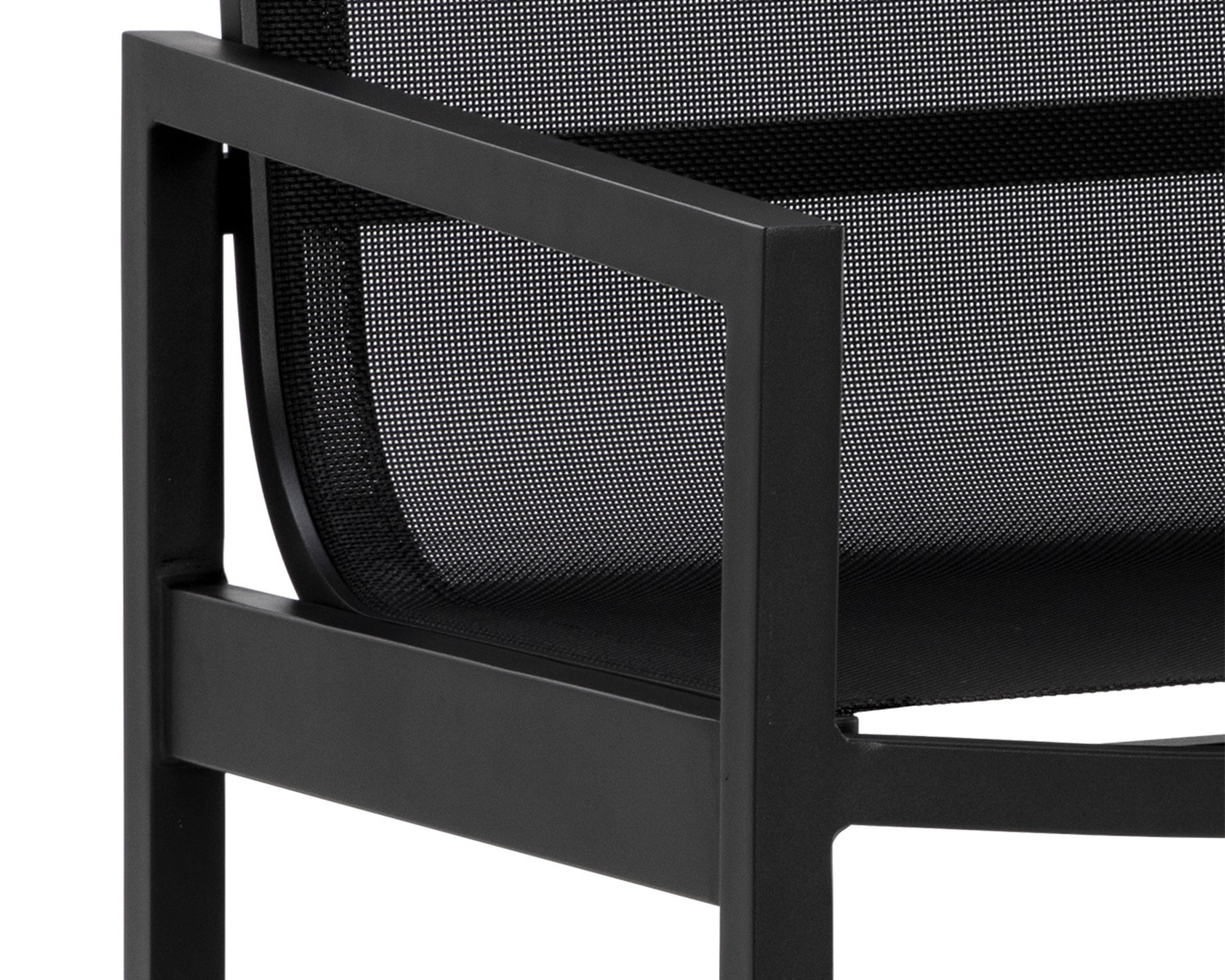 The Merano Dining Armchair is a modern take on classic design. The black powder-coated aluminum frame beautifully complemments the breathable mesh seatback for a comfortable dining experience.