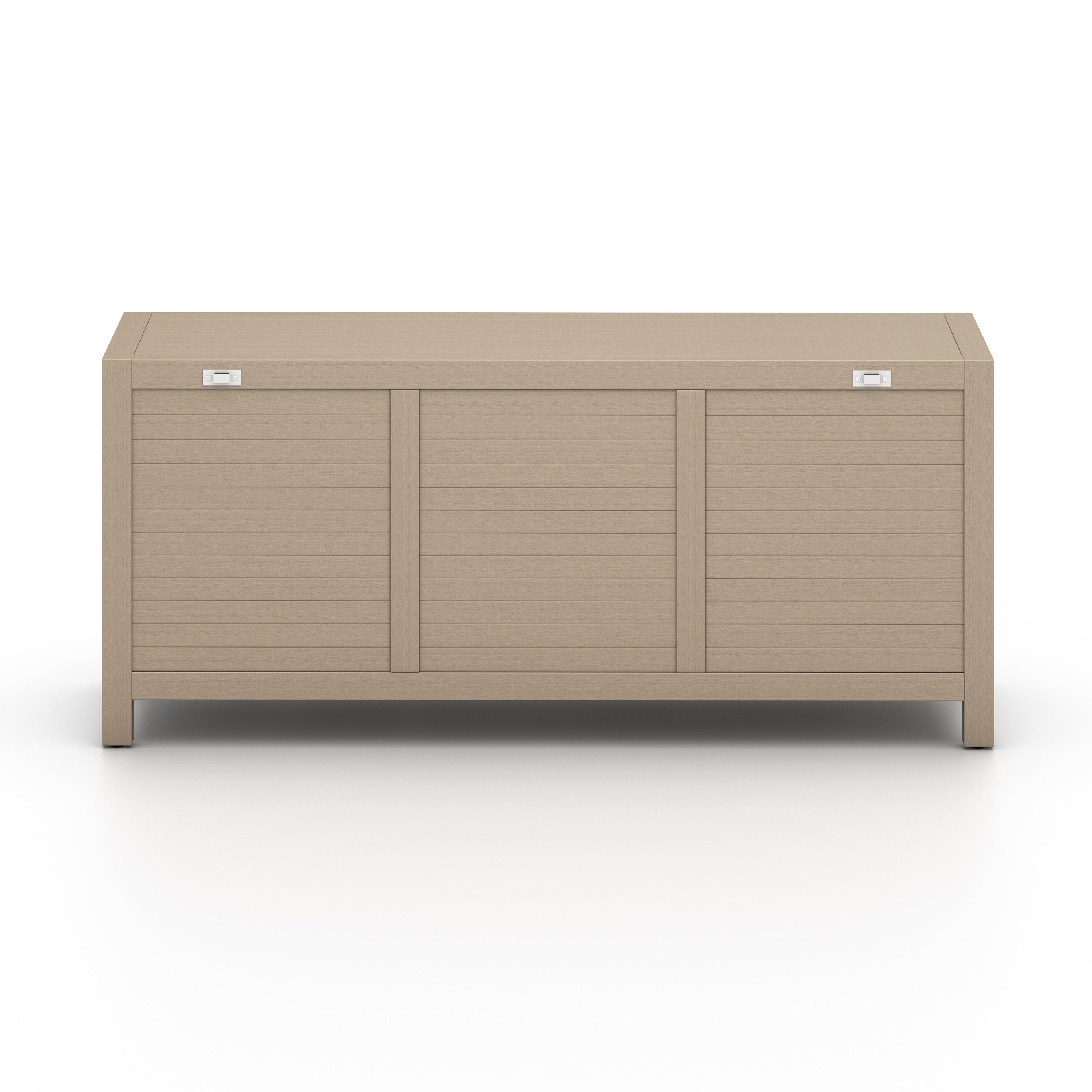 Take outdoor storage to new heights. Finished in a washed brown, solid FSC-certified teak forms a modern-minded sideboard, with slatted fronts for a light, linear look. Cover or store indoors during inclement weather and when not in use.