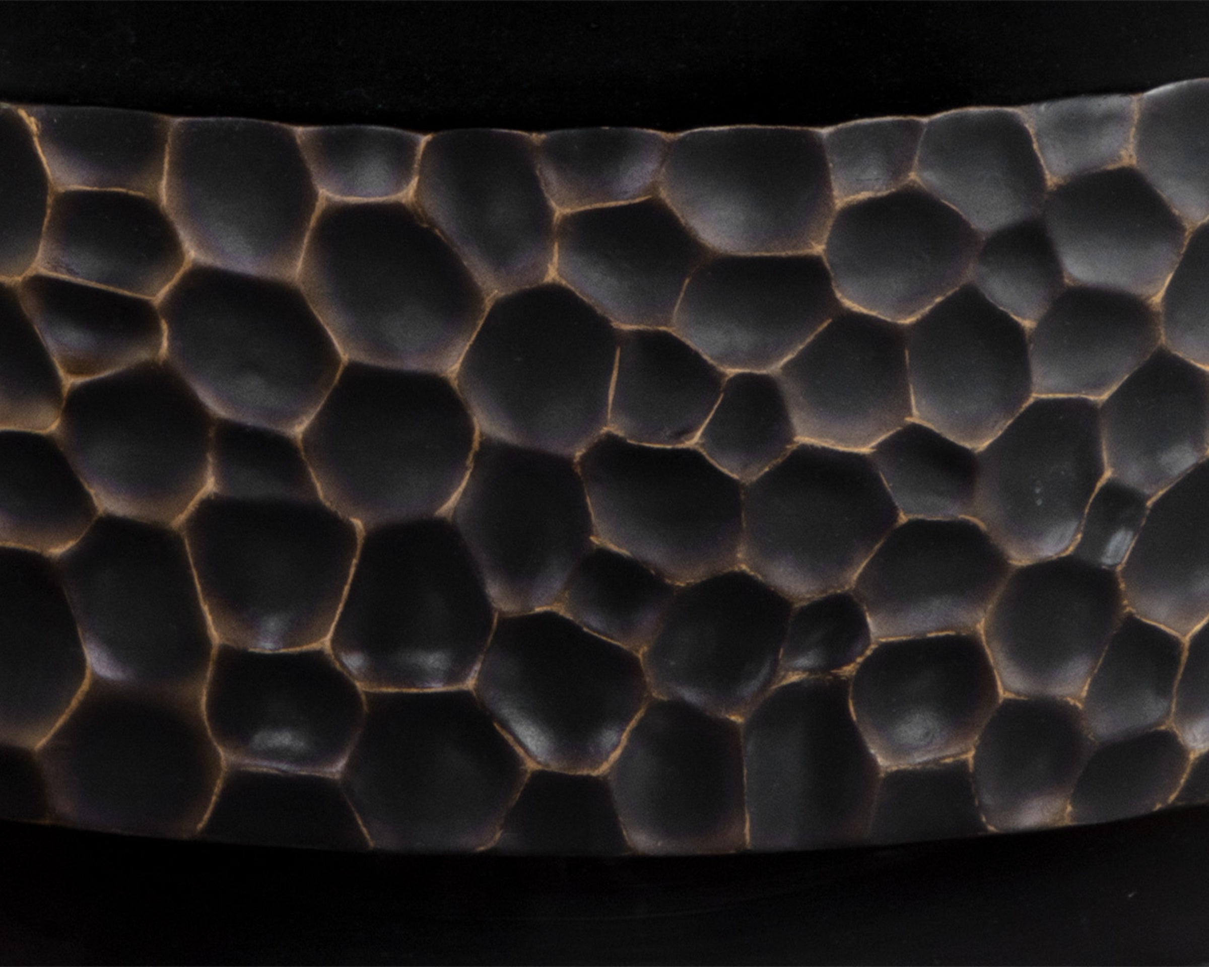 Accentuate any dining area with the stunning Mersin Dining Table. Constructed from black glass fibre-reinforced concrete, this piece has a remarkable hand-hammered design on the table top and base. Brass coloured accents emphasize the textured look.