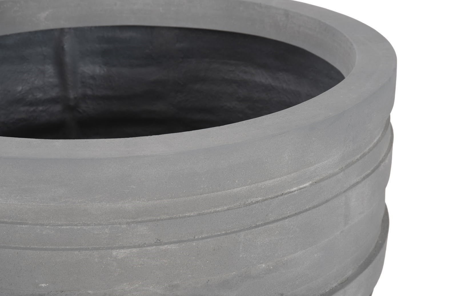 The June Medium Raw Gray Planter looks like a vintage planter with its raw gray finish. Made of composite, its surface is striated to mimic fabric that has been wrapped around a vessel and slathered in a beautiful papier-mâché treatment. One of the loveliest aspects of this design is that it is strikingly contemporary for a garden planter thanks to its warm gray finish and the top lip that rolls into its interior to leave the shape clean-lined. We offer this gray garden planter in a number of sizes and we have white planters in round and square shapes. Each of these reflects the ethos that Phillips Collection personifies: modern organic.