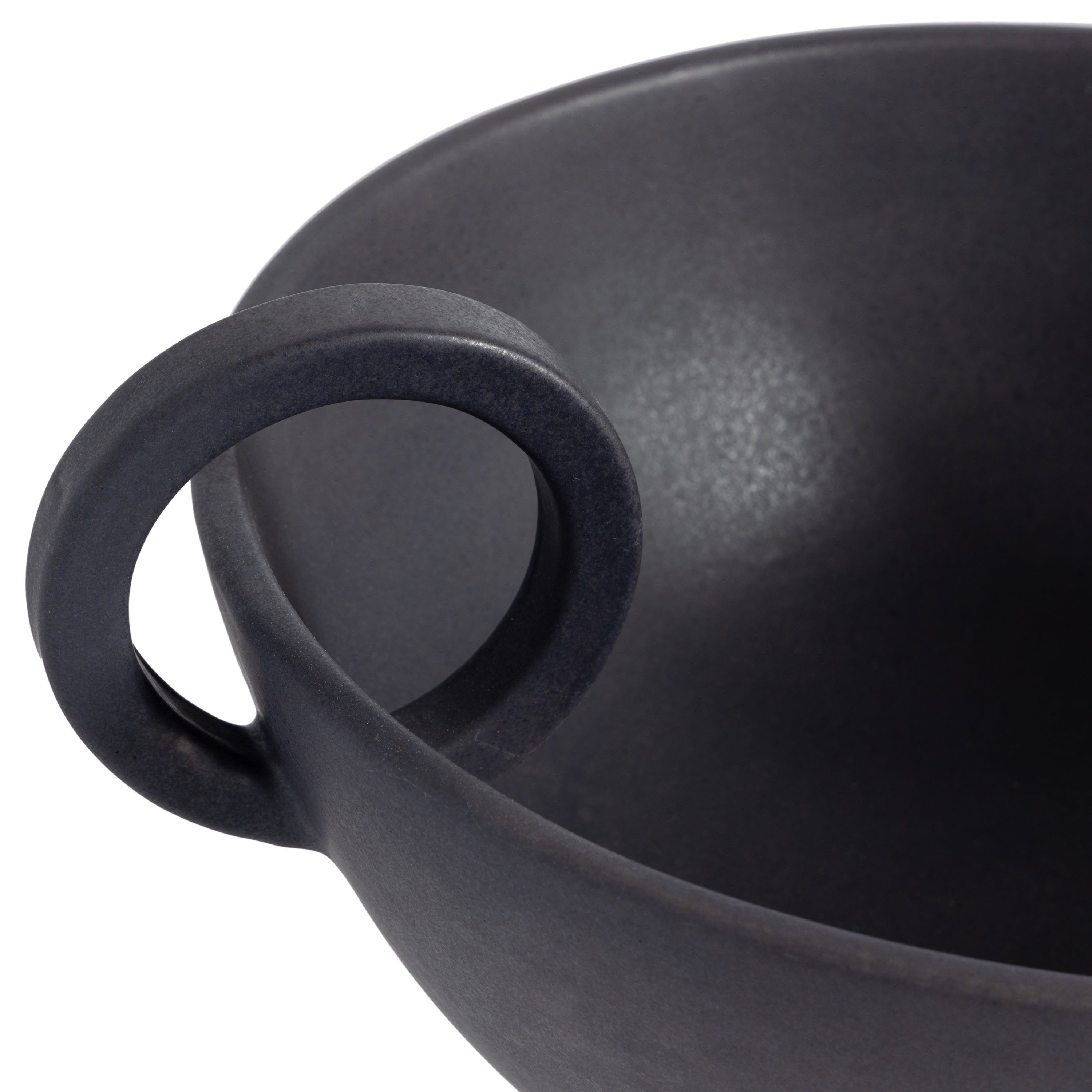 Bold shapes and proportions compose dynamic visual weight with a vessel atop a smaller base, accented by perfect circular handles. Finished in a clean matte black. Subtle variations in overall size are to be expected and convey the handmade nature of each individual vase.