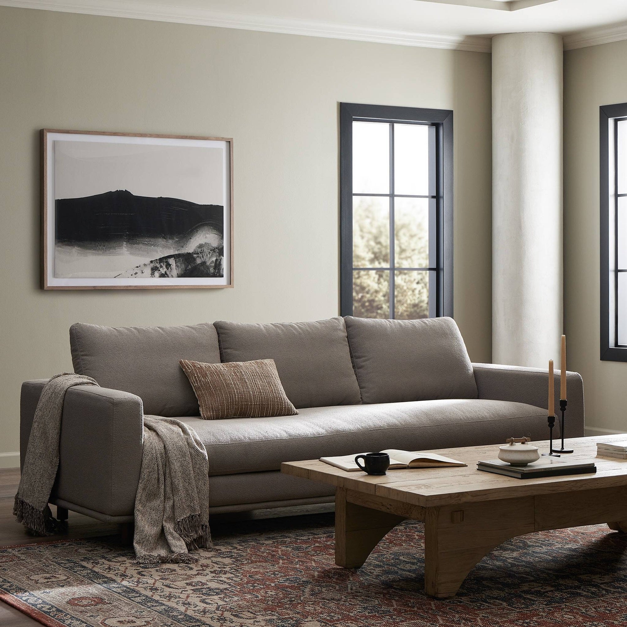 Textural polyester brings livability to an impactful silhouette. Pristinely tailored upholstery with clean track arms and loose feather-blend cushioning for total comfort.