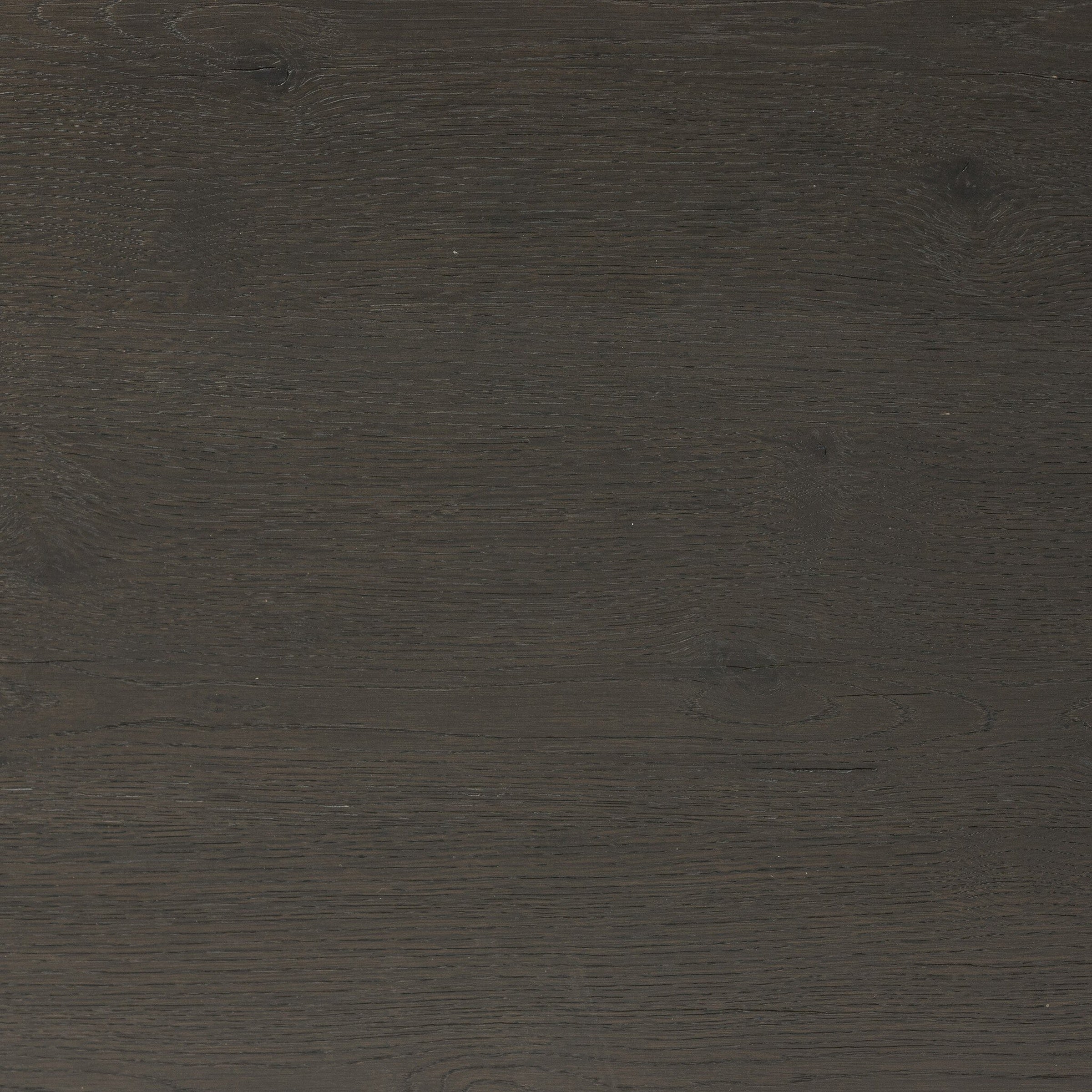 Made from solid oak and thick oak veneer finished in a smoked black, a long, streamlined console offers ample media storage space behind four push-latch doors. Subtly rounded corners add softness to otherwise clean lines, while rear cutouts offer seamless cord management.