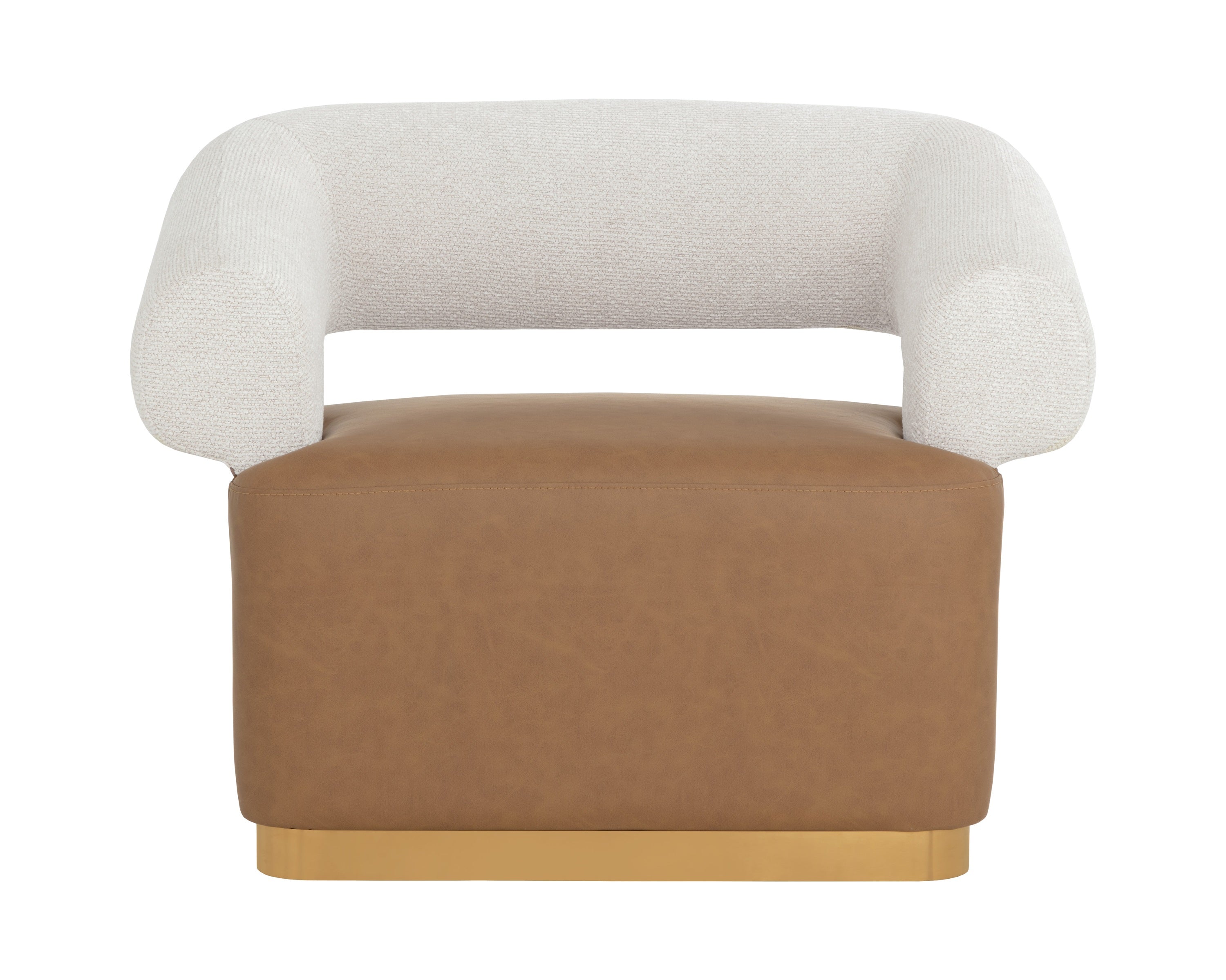The Aggie Swivel Lounge chair is a statement-making mid-century accent chair with curves in all the right places. Upholstered in milliken cognac faux leather and rhea light barley fabric with a brushed gold stainless steel base, this lounge chair is a beautiful spectacle with its harmonious mix of colours and textures.