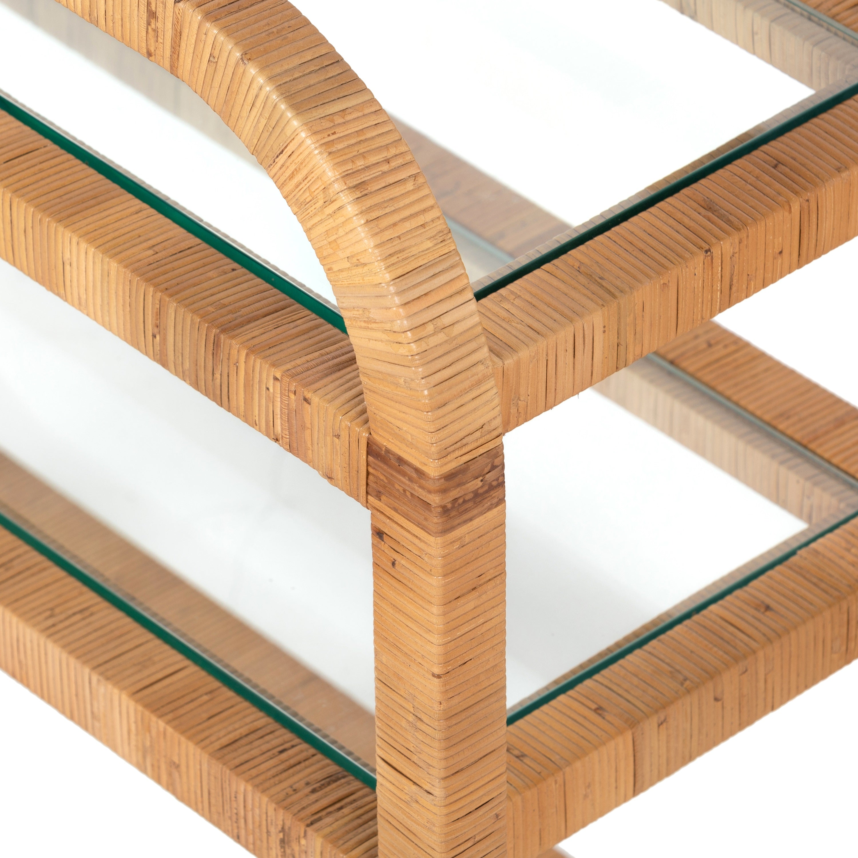 Roll with the party. Honey-finished rattan forms a rounded, Seventies-inspired frame for three tiers of tempered glass shelving perfect for storing go-to bottles and glassware, with casters for clever mobility.